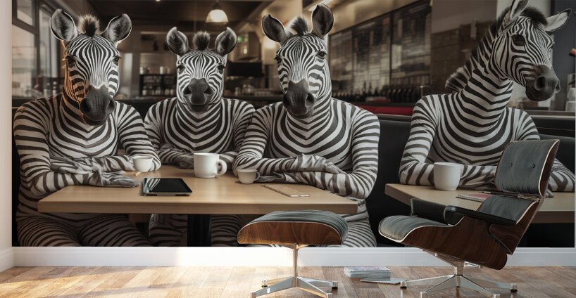 This captivating piece by David Mantegh, crafted at Mantegh Studio, transports viewers to a whimsical cafe scene featuring four zebras enjoying a coffee break. Dressed in matching zebra-striped attire, the characters sit around a table, surrounded by a warm and inviting cafe setting. The juxtaposition of everyday life with surreal elements creates a delightful visual narrative that evokes humor, curiosity, and a sense of whimsy. The black and white stripes of the zebras contrast elegantly with the contemporary cafe decor, resulting in a unique and memorable art piece. This artwork exemplifies Mantegh Studio’s dedication to creating imaginative, high-quality art that transforms spaces and captivates viewers with its playful and creative storytelling.