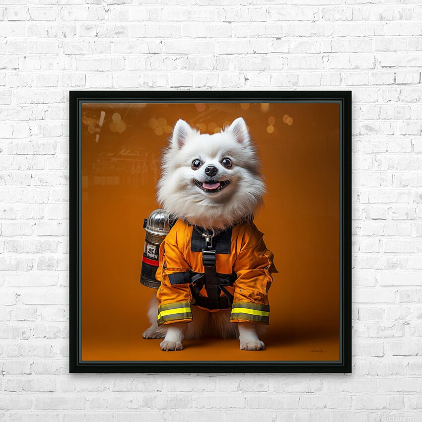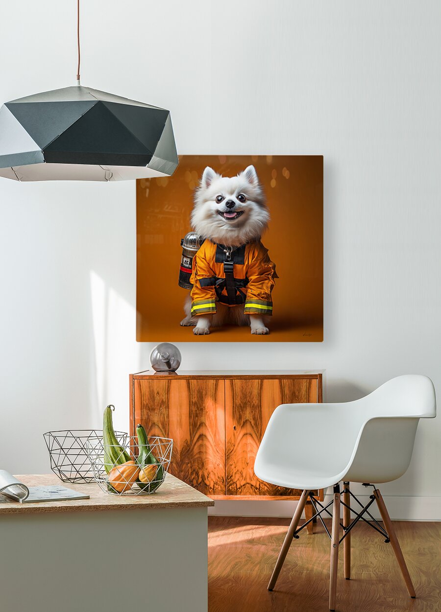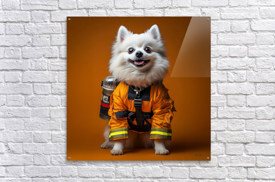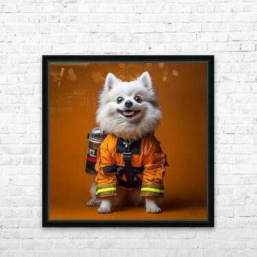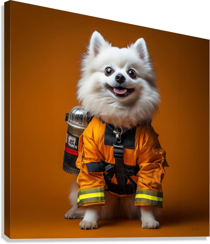 This whimsical artwork by David Mantegh, showcased at Mantegh Studio, features an adorable white Pomeranian dressed as a firefighter. Set against a bold orange background, the piece exudes playfulness, charm, and creativity. The dog's expressive eyes, fluffy fur, and detailed orange firefighter suit make it a captivating focal point, blending humor with artistic flair. This imaginative portrayal of a pet in a heroic role creates an engaging and delightful visual narrative, perfect for adding warmth and personality to any space. Reflecting Mantegh Studio’s dedication to unique and high-quality art, this piece appeals to pet lovers, art enthusiasts, and anyone seeking a touch of playful elegance in their decor.