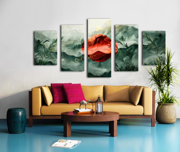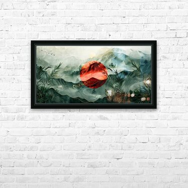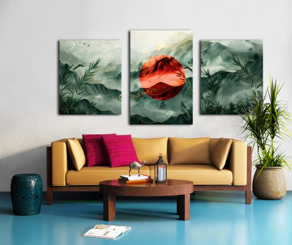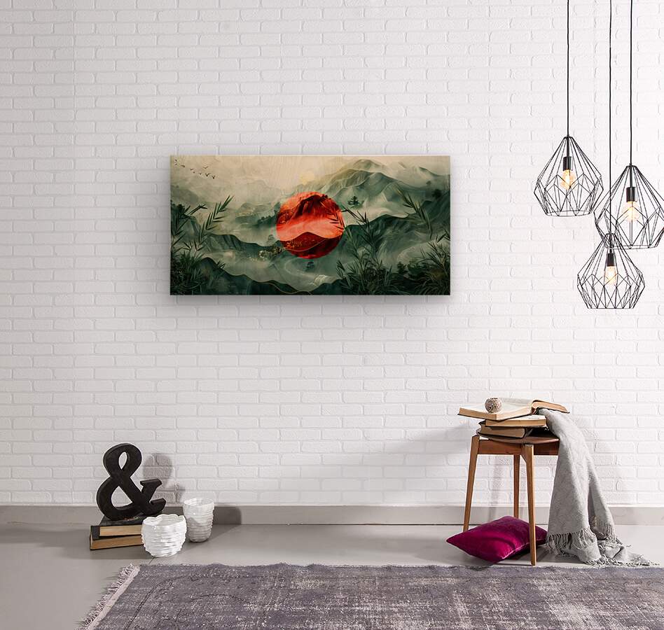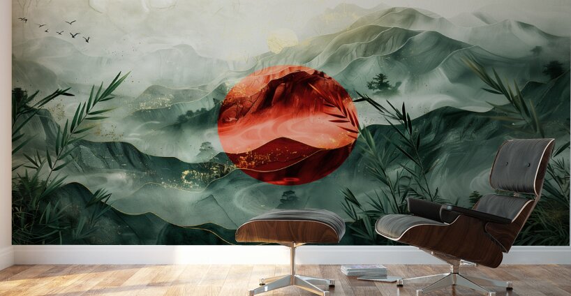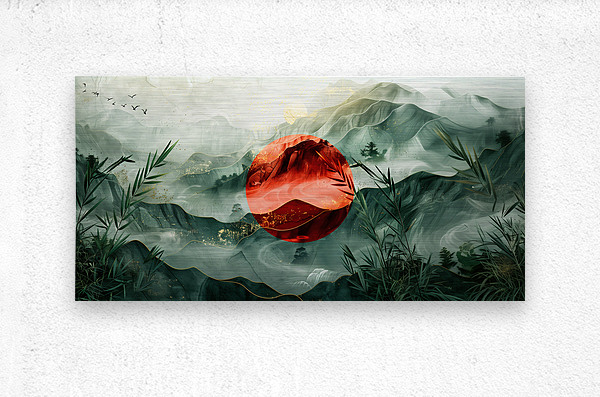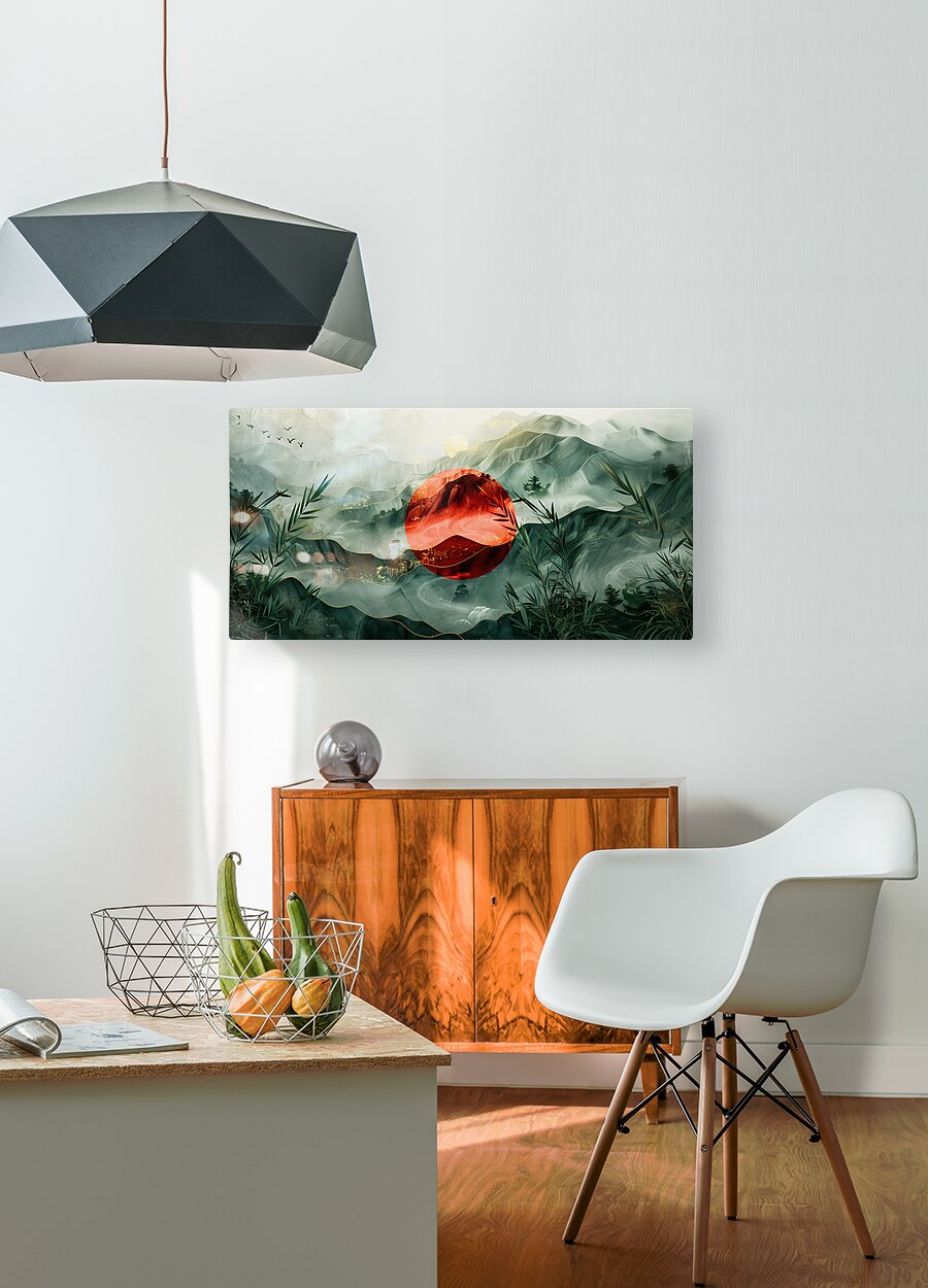 This stunning artwork titled "Japan" by David Mantegh, created at Mantegh Studio, beautifully captures the essence of a serene Japanese-inspired landscape. The painting features a striking red sun that stands out against misty, green-layered mountains, symbolizing tradition and nature in harmony. Bamboo elements frame the foreground, enhancing the connection to Japanese culture and natural beauty. The interplay of red and green hues, with delicate gold accents, evokes a sense of balance, peace, and timeless elegance. This captivating piece exemplifies Mantegh Studio's dedication to creating high-quality, meaningful art that transforms any space with its sophisticated design and cultural storytelling.