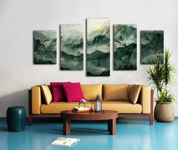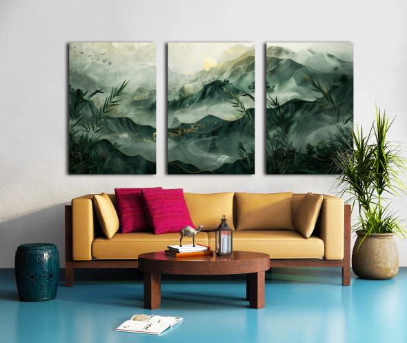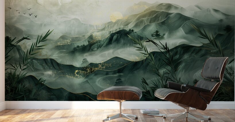 This serene mountain landscape by David Mantegh, crafted by Mantegh Studio, invites viewers into a tranquil world of misty peaks and lush greenery. The layered mountains are depicted with a delicate blend of greens and gold accents, evoking a sense of depth, calm, and natural splendor. Bamboo elements and subtle touches of birds in flight enhance the connection to nature, creating a peaceful and harmonious scene. The soft, flowing lines and atmospheric light give the artwork a dreamlike quality, making it a stunning addition to any interior space. Reflecting Mantegh Studio’s dedication to creating high-quality, imaginative designs, this piece is perfect for those who appreciate the beauty of nature and art combined.