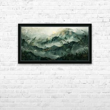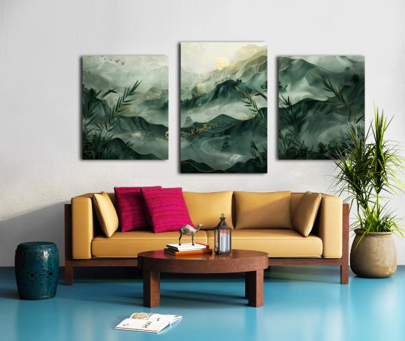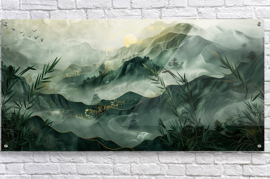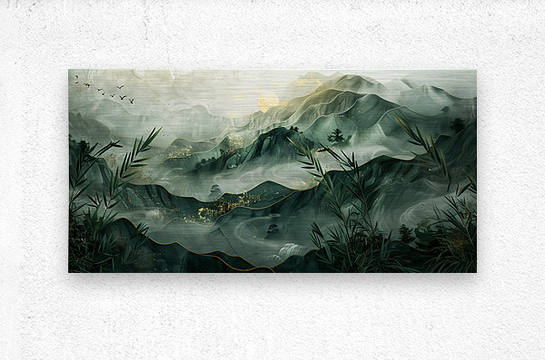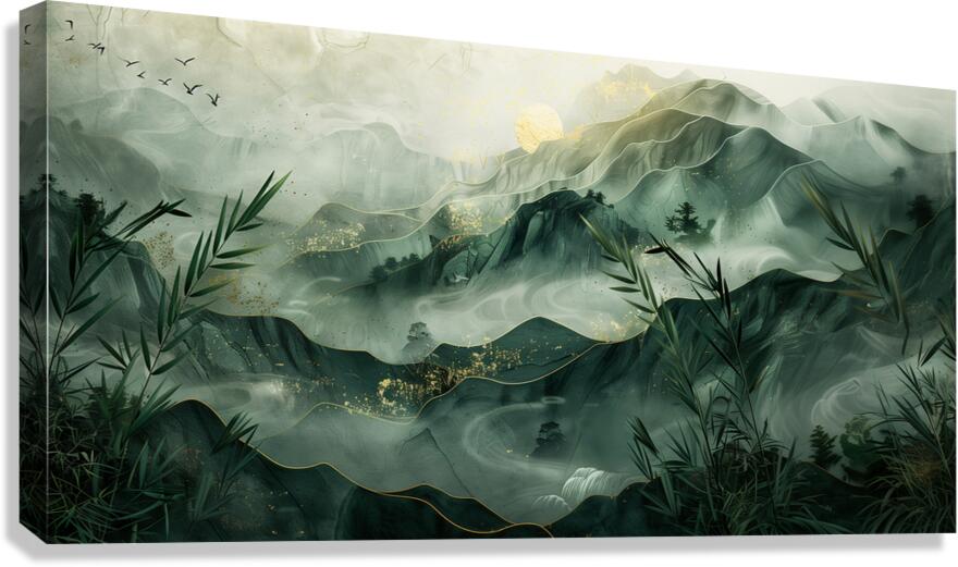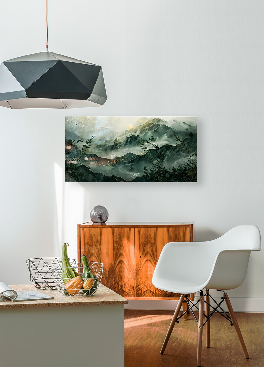 This serene mountain landscape by David Mantegh, crafted by Mantegh Studio, invites viewers into a tranquil world of misty peaks and lush greenery. The layered mountains are depicted with a delicate blend of greens and gold accents, evoking a sense of depth, calm, and natural splendor. Bamboo elements and subtle touches of birds in flight enhance the connection to nature, creating a peaceful and harmonious scene. The soft, flowing lines and atmospheric light give the artwork a dreamlike quality, making it a stunning addition to any interior space. Reflecting Mantegh Studio’s dedication to creating high-quality, imaginative designs, this piece is perfect for those who appreciate the beauty of nature and art combined.