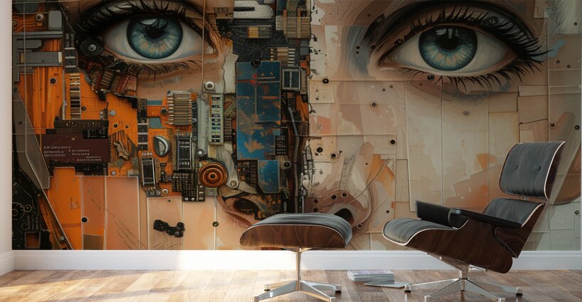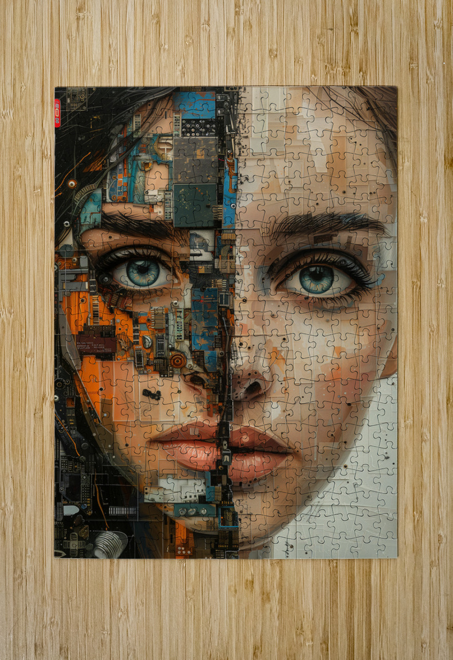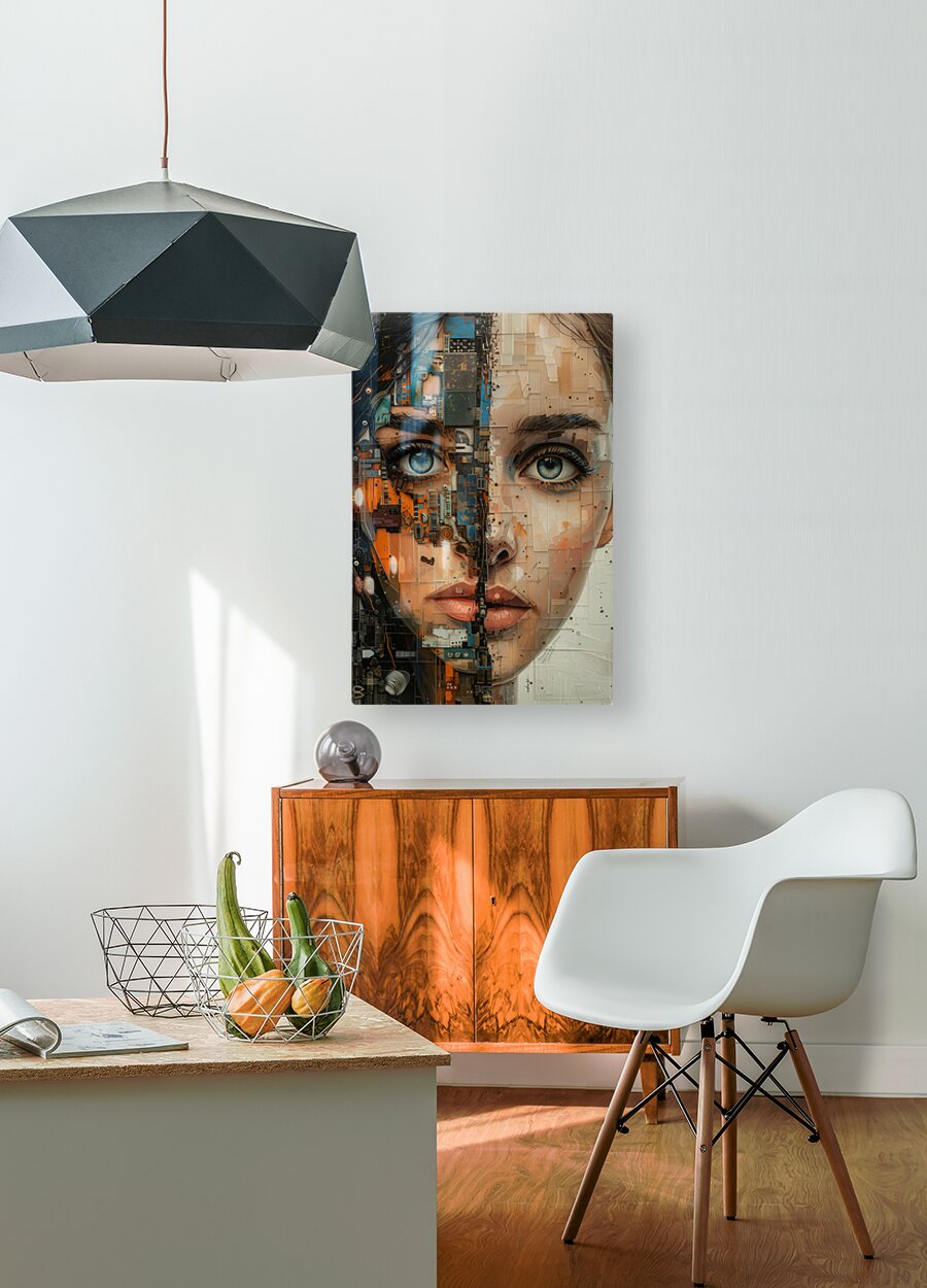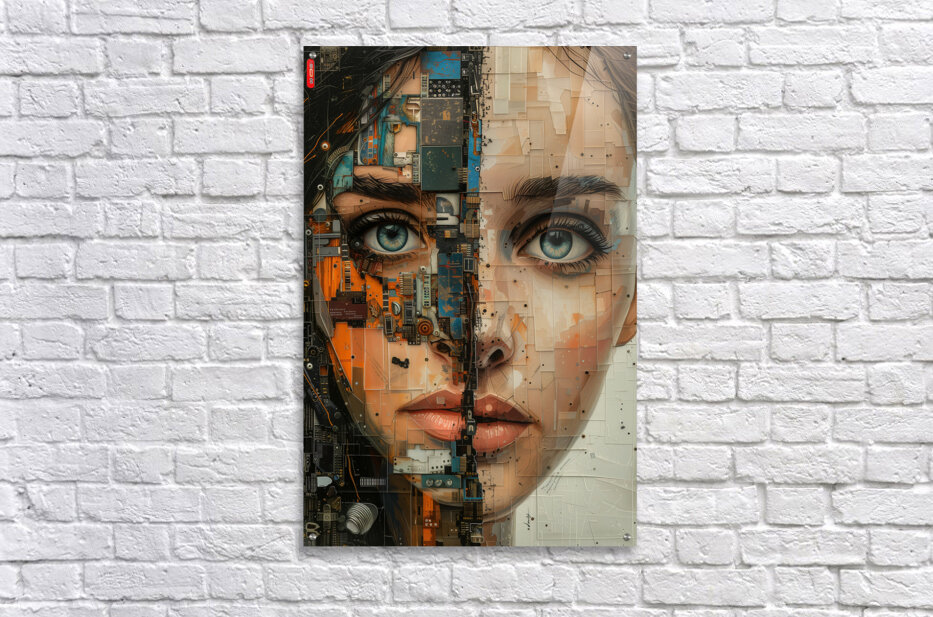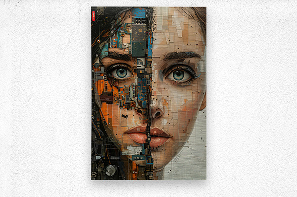 Title: parallel essence-2. This striking cybernetic portrait by David Mantegh, presented by Mantegh Studio, bridges the human and technological realms through a compelling blend of realism and futuristic abstraction. The artwork portrays a female face split between organic features and mechanical textures, creating a visual narrative that explores themes of identity, technology, and evolution. The intricate detailing of circuit boards, mechanical elements, and vibrant colors juxtaposed with her expressive eyes and soft features evoke a sense of tension and intrigue. This unique piece exemplifies Mantegh Studio’s commitment to pushing artistic boundaries, making it a standout addition for those seeking thought-provoking, high-quality art that sparks conversation and imagination.