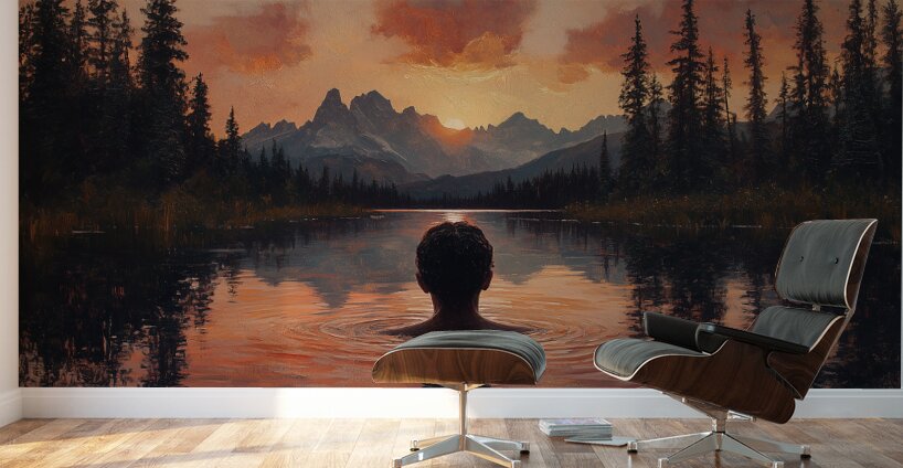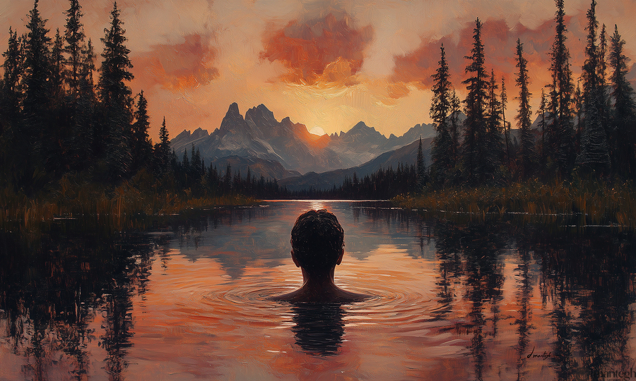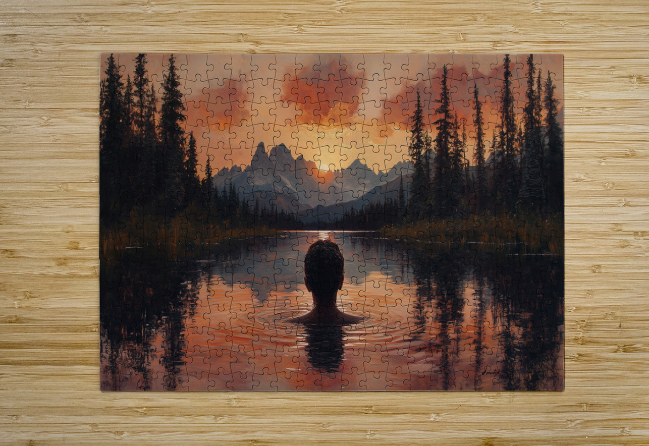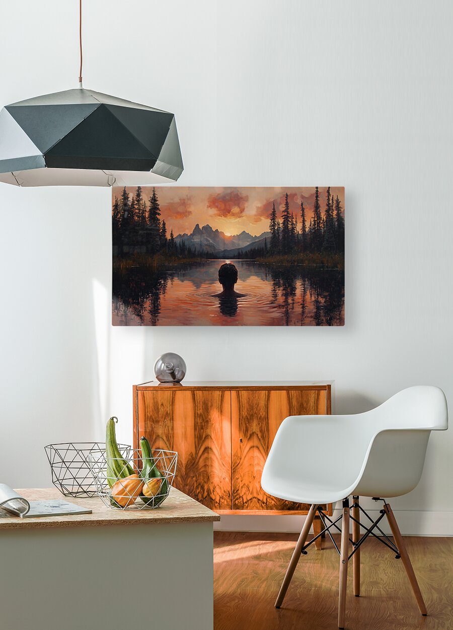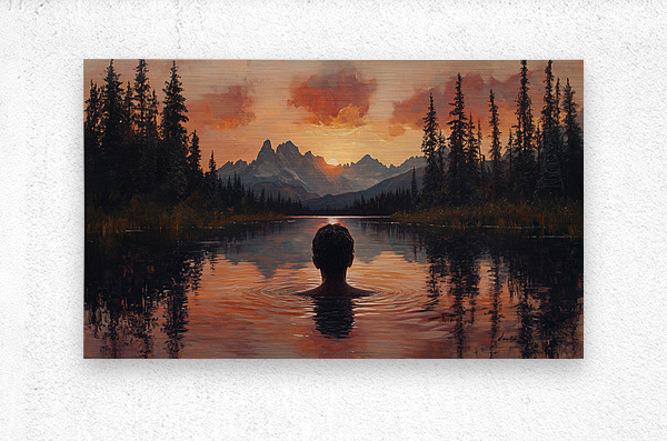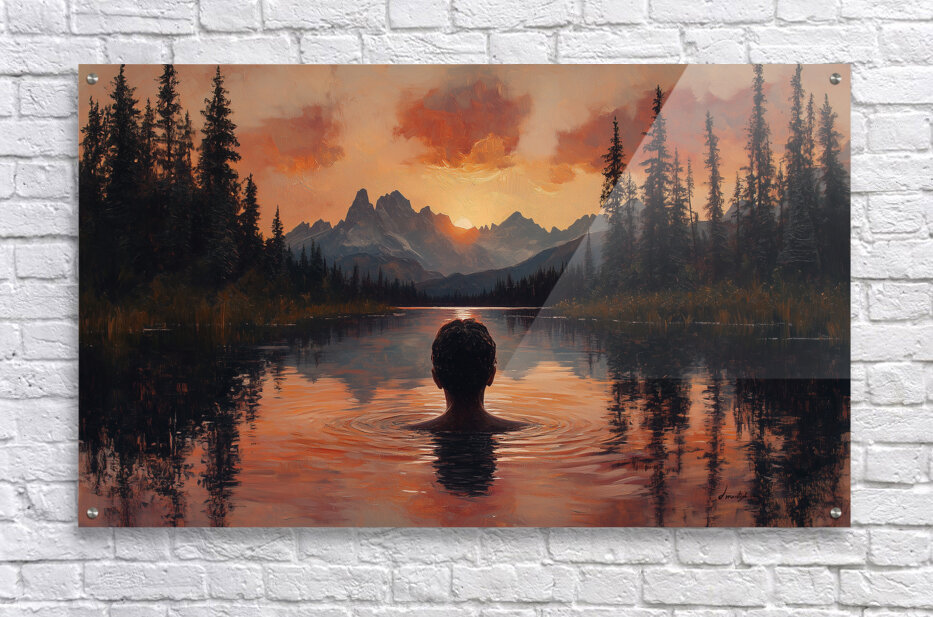 captivating sunset landscape by David Mantegh, crafted at Mantegh Studio, features a man standing in a serene lake, gazing at a breathtaking sunset over distant mountains. The rich hues of orange, red, and soft purples reflect beautifully in the water, creating a warm and immersive atmosphere. The figure's contemplative pose and the surrounding natural beauty evoke a sense of peace, introspection, and connection with the vastness of nature. This stunning piece exemplifies Mantegh Studio's dedication to creating high-quality, meaningful art that brings the beauty and depth of natural moments to life, making it a perfect addition to any setting.