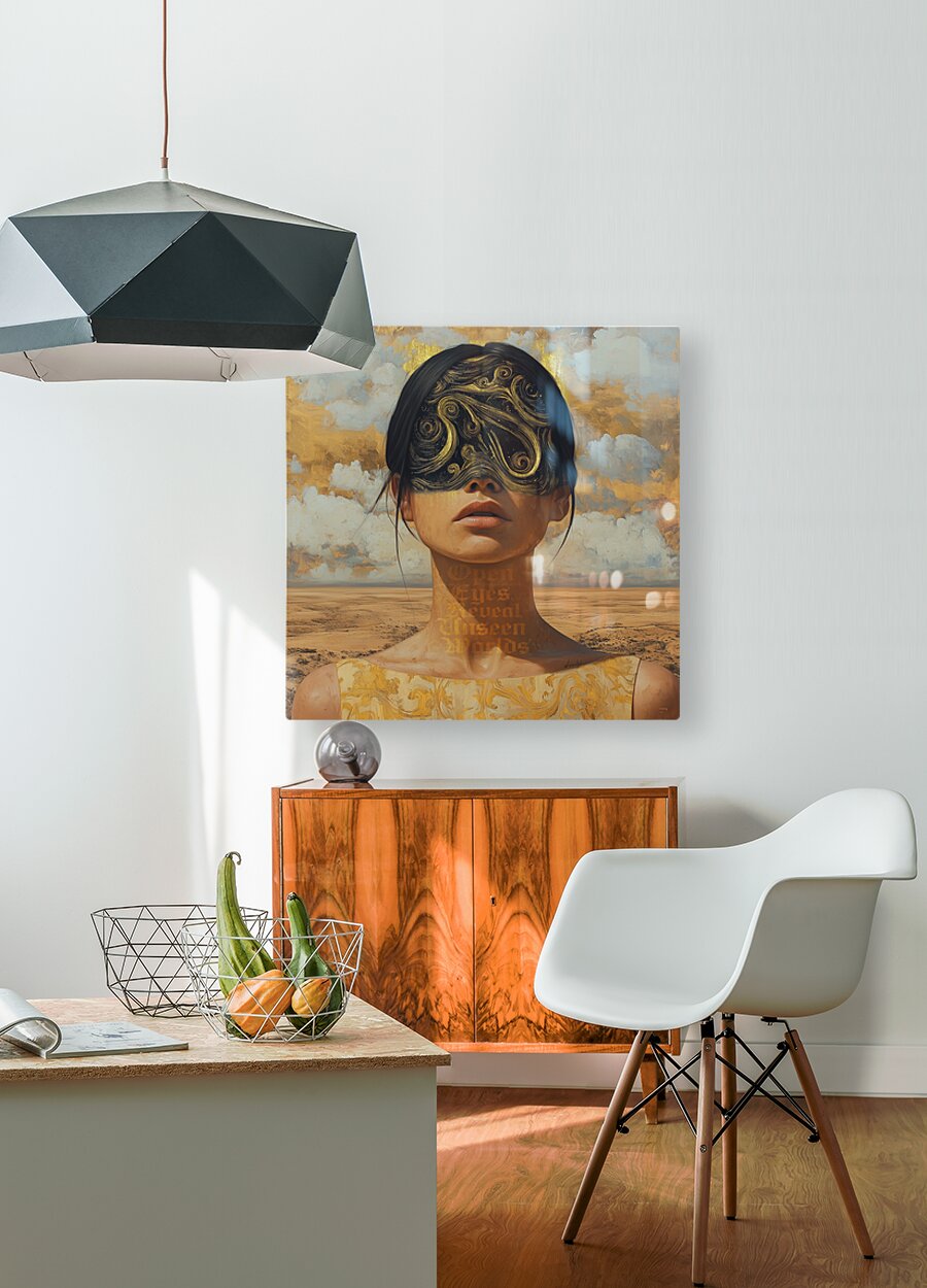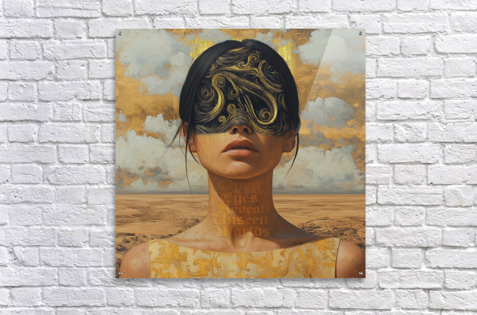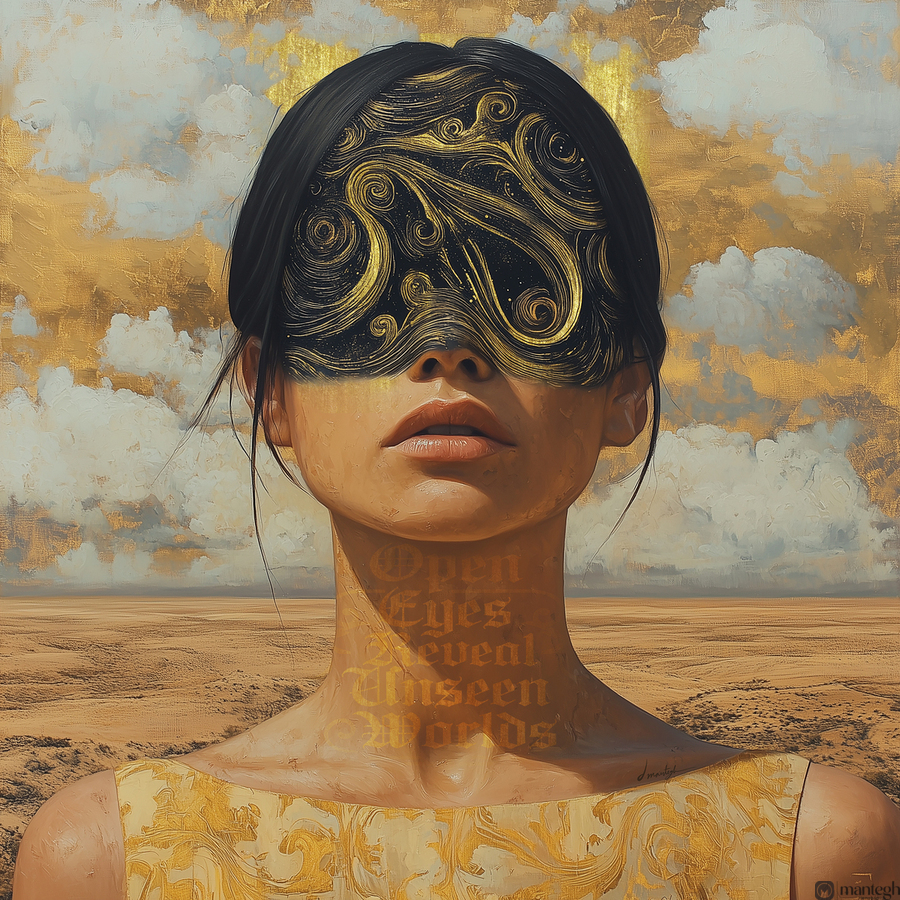 This artwork by David Mantegh showcased by Mantegh Studio blends surrealism and symbolism featuring a female figure with swirling golden patterns covering her eyes and the phrase Open eyes reveal unseen worlds woven into the composition. The artwork explores themes of perception hidden depths and self-discovery. Set against a luminous golden backdrop it invites viewers to journey beyond the surface reflecting Mantegh Studio’s dedication to creating evocative thought-provoking art.