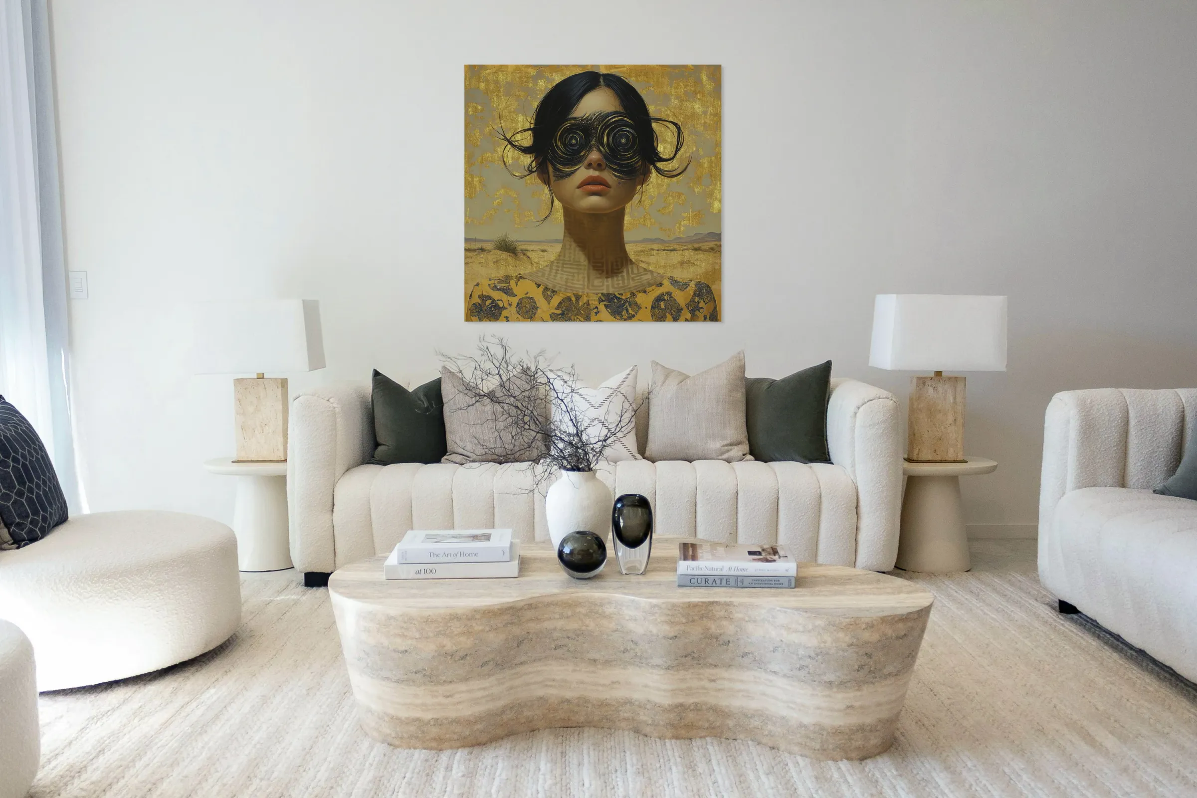 This surreal portrait by David Mantegh, showcased by Mantegh Studio, features a striking female figure adorned with intricate spiral-patterned eyewear set against a shimmering gold backdrop. Her flowing hair and elegant dress are complemented by a detailed neck pattern, creating a mesmerizing blend of tradition and modernity. The golden tones evoke warmth and luxury, while the surrealist elements invite deeper interpretation and storytelling. This imaginative piece exemplifies Mantegh Studio's dedication to blending artistic craftsmanship with bold, thought-provoking themes, transforming any space into an evocative visual experience.
