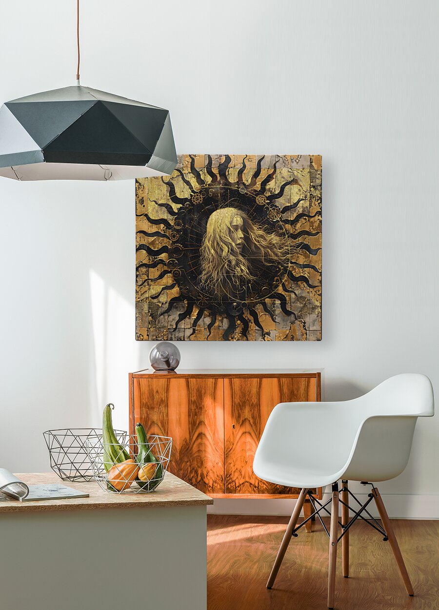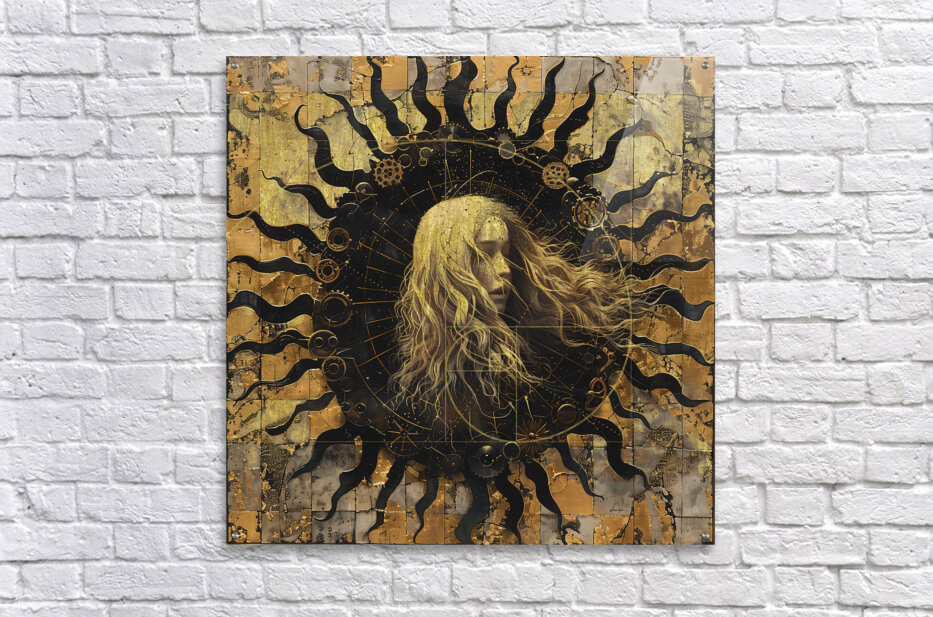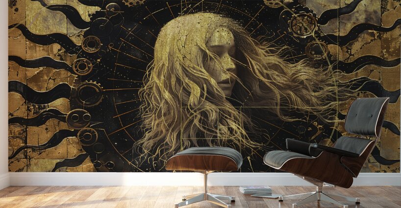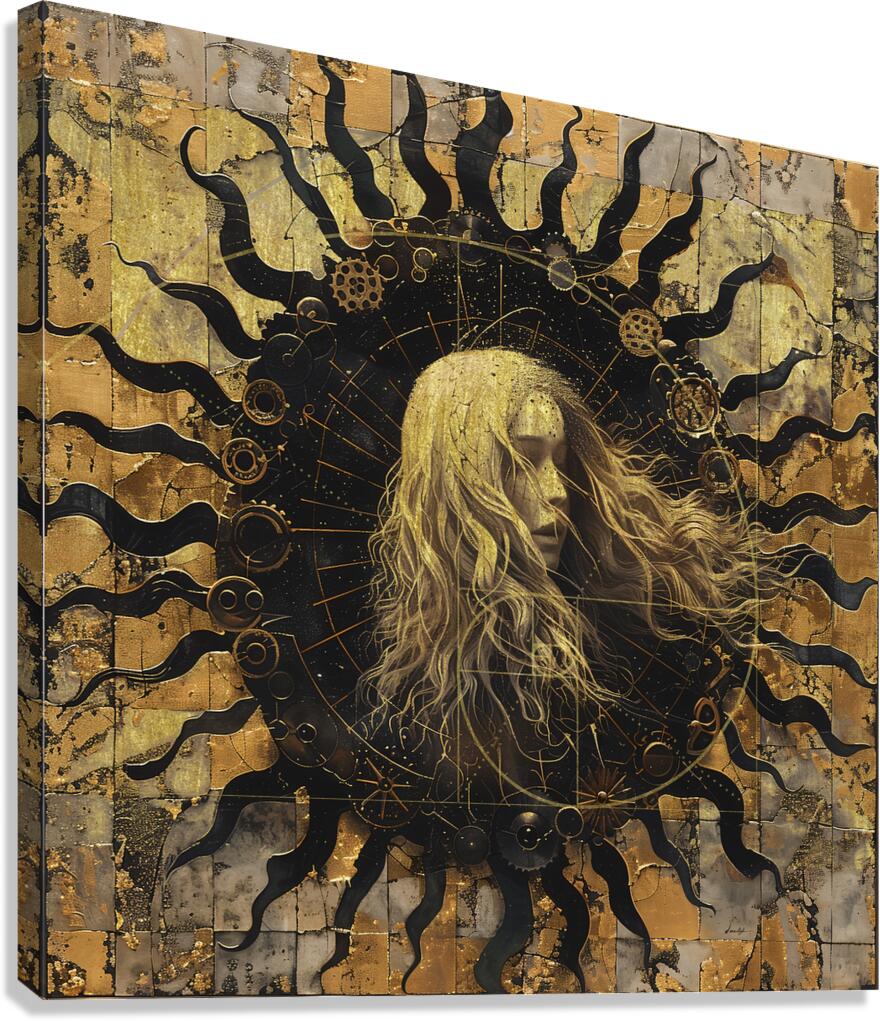 Titled "Time," this piece by David Mantegh, delves into the concept of time through an intricate, golden composition. The artwork features a central female figure with flowing hair, standing before a mesmerizing clock-like structure filled with gears, cogs, and celestial elements. The juxtaposition of the human form with the mechanical and celestial motifs invites contemplation on the passage of time, destiny, and the universe's mysteries. The lavish use of gold evokes a sense of luxury, elegance, and timeless beauty. This artwork exemplifies Mantegh Studio’s dedication to creating thought-provoking and visually stunning pieces that elevate any space, blending symbolism, artistry, and captivating storytelling.