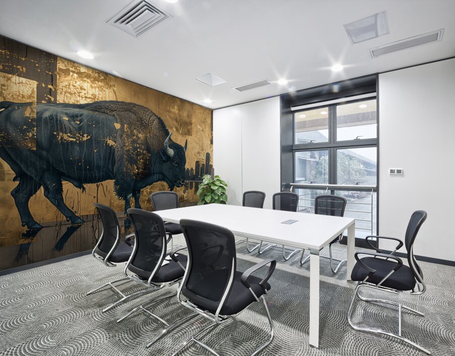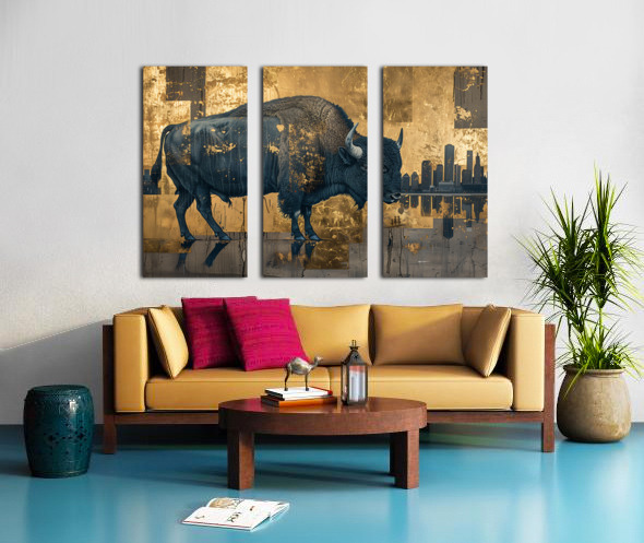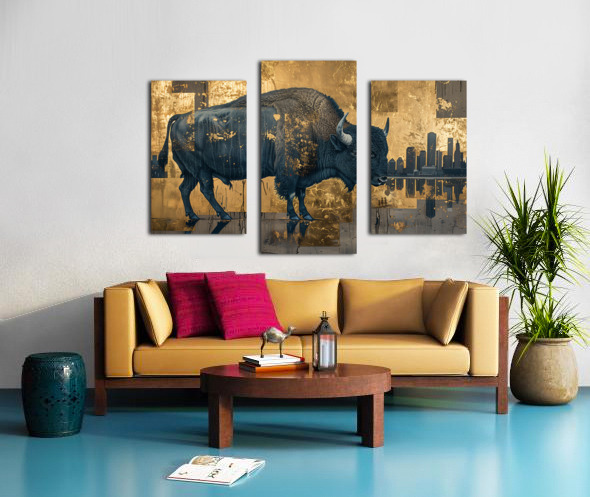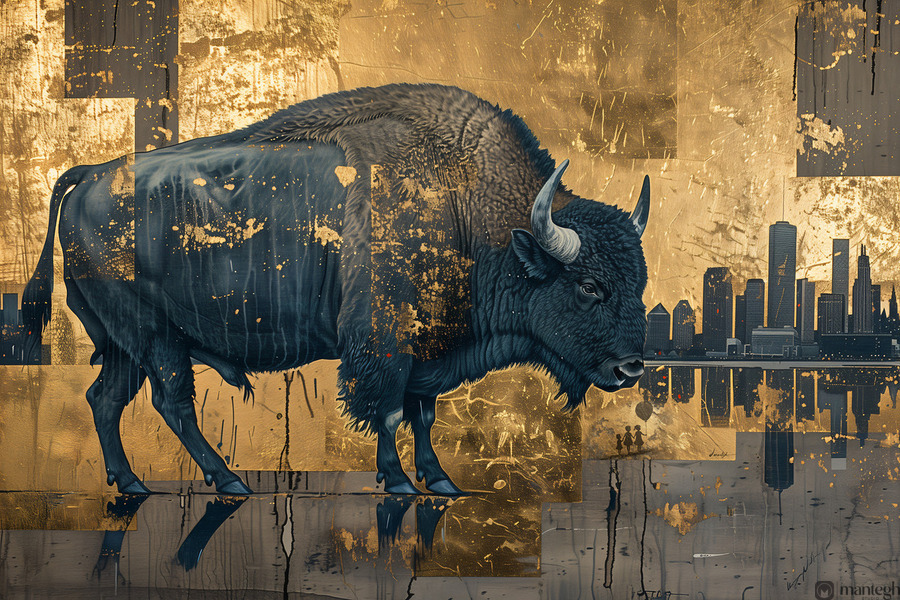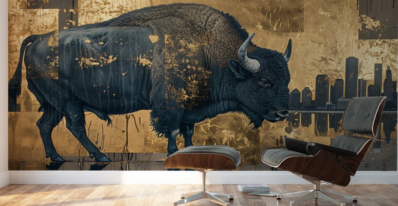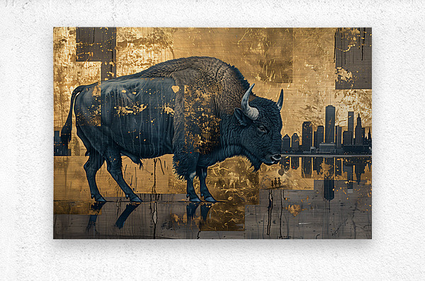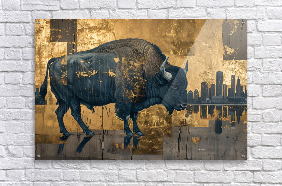 Titled "Buffalo in the City," this artwork by David Mantegh, juxtaposes the majesty of a buffalo against a contemporary urban cityscape. The rich blue tones of the buffalo stand out against a shimmering gold backdrop, creating a powerful contrast that emphasizes the tension between nature and modernity. The intricate textures and reflective elements evoke a sense of depth and storytelling, while the silhouette of the city adds a contemporary twist to the timeless symbol of the buffalo. This bold and imaginative piece exemplifies Mantegh Studio's dedication to creating high-quality art that blends tradition, nature, and modern design, transforming any space with its visual impact and narrative depth.