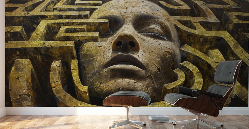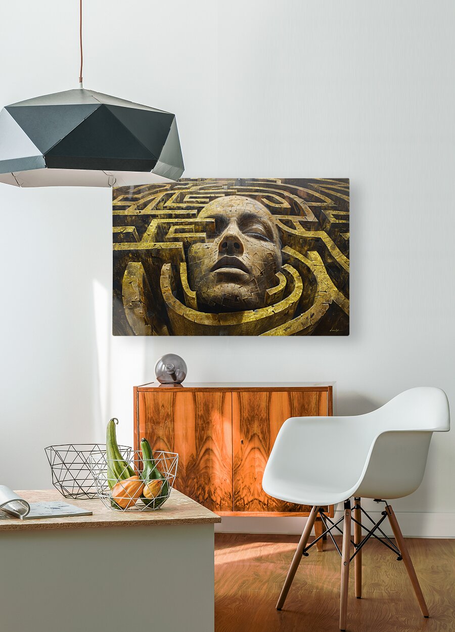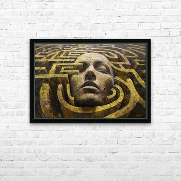"Echoes of the Past 003" by David Mantegh, invites viewers into a complex labyrinth surrounding a monumental human face. This textured, golden composition embodies the struggles of navigating through history, memory, and transformation. The serene expression of the face, juxtaposed with the intricate maze structures, symbolizes the internal and external challenges faced by humanity in finding its path through change and the remnants of past worlds. The gold tones create a sense of grandeur and timelessness, while the complex pathways evoke introspection and exploration. This artwork exemplifies Mantegh Studio’s dedication to merging conceptual depth with artistic craftsmanship, offering a powerful reflection on legacy, continuity, and human perseverance.