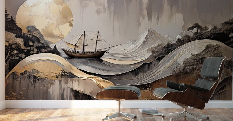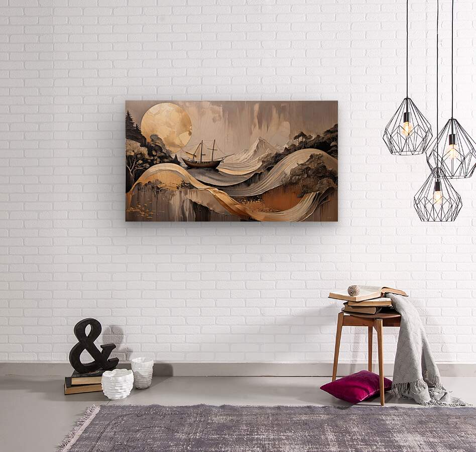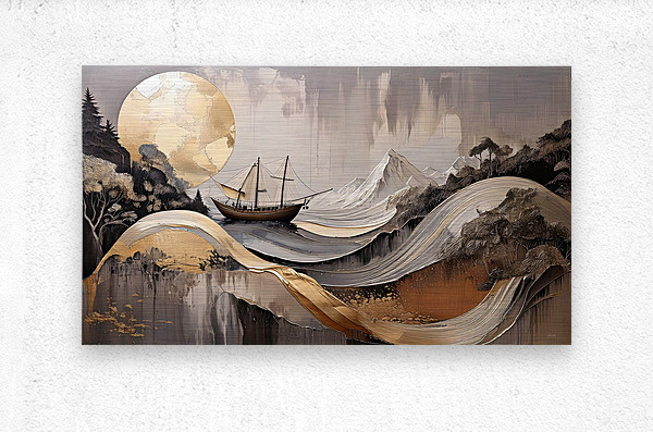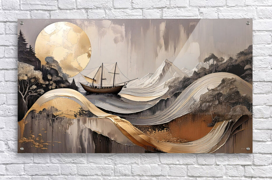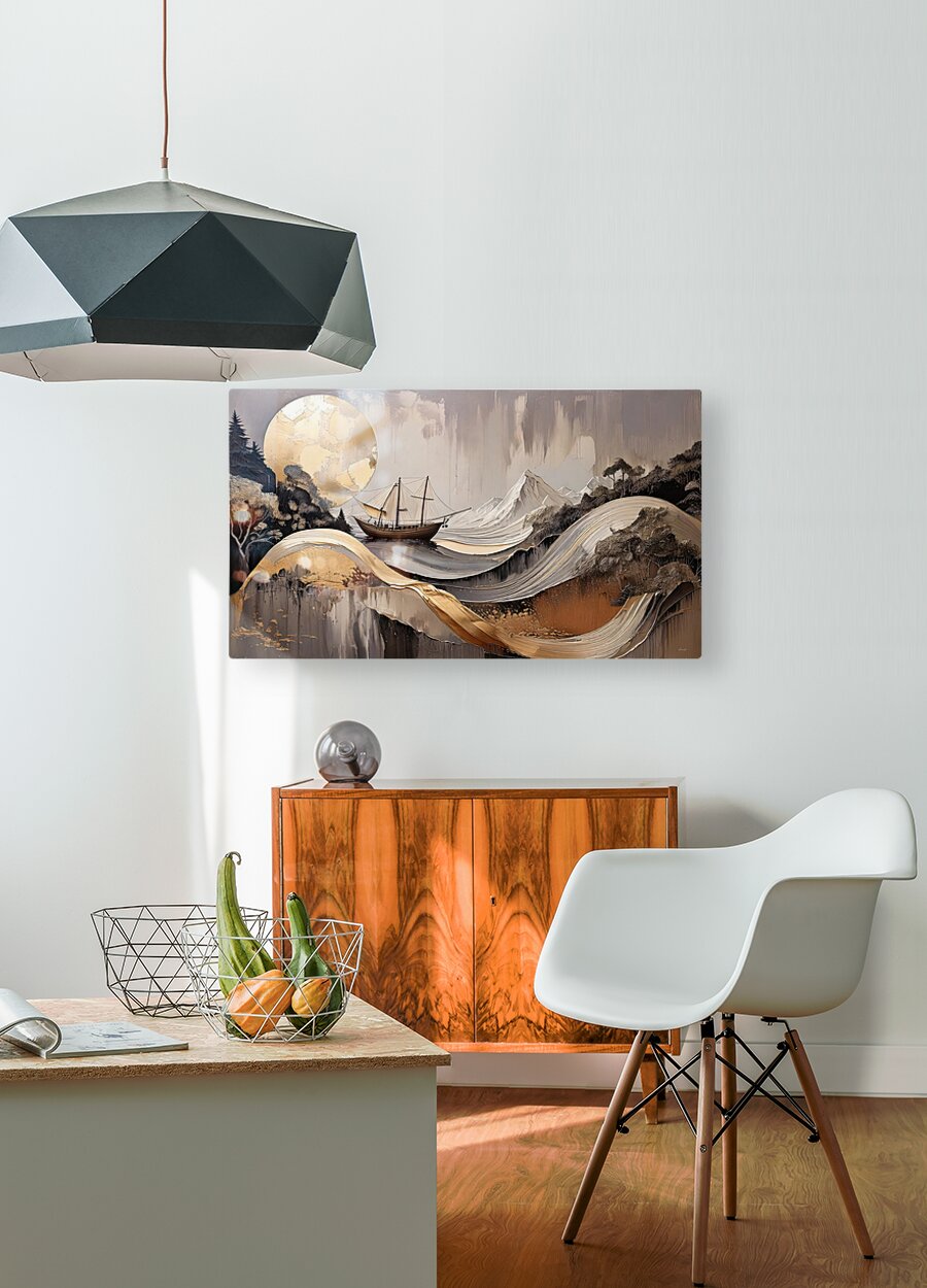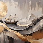 "Horicon 002" merges the grandeur of mountains and the elegance of the sea in a captivating composition. A sailing ship glides serenely through layered golden waves, set against a backdrop of abstract mountains and a luminous golden sun. The artwork seamlessly blends natural and nautical themes, using rich textures and metallic accents to evoke a sense of timeless beauty. This contemporary piece invites viewers to reflect on the balance between nature and human exploration, making it a perfect addition to modern interiors seeking a touch of elegance and inspiration.