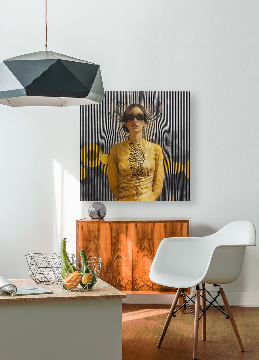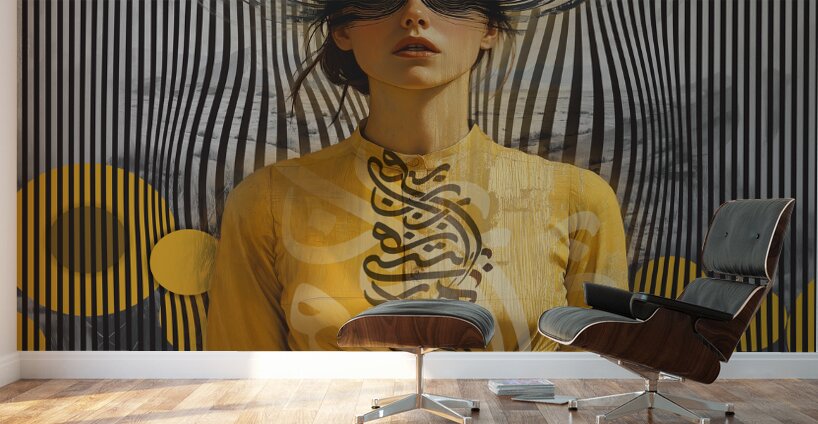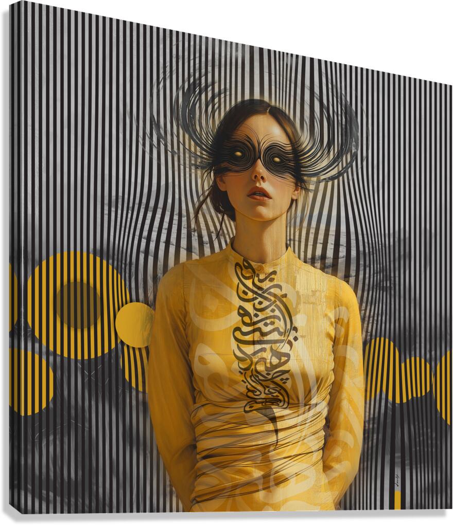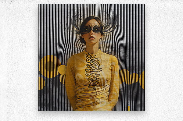 "Women-Time-Space 004" is a striking portrayal of cultural fusion and symbolic expression, masterfully blending Arabic calligraphy with surreal visual patterns. David Mantegh creates a mesmerizing interplay between golden tones and hypnotic line work, encapsulating themes of identity, spirituality, and modern surrealism. The figure's bold gaze and intricate design elements evoke a sense of empowerment and contemplation, inviting viewers to explore the depths of cultural heritage and individual strength. This artwork serves as a contemporary homage to tradition and innovation, making it a captivating piece for modern art enthusiasts and collectors.