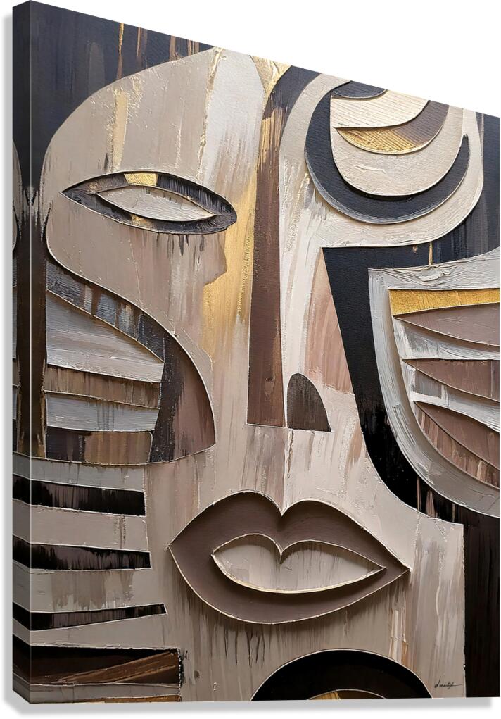 This decorative artwork features an abstract African mask with intricate textures and golden accents. Designed to complement modern interiors, it blends cultural symbolism with contemporary design. The harmonious combination of earthy tones and bold patterns adds sophistication to any space.