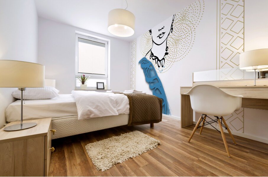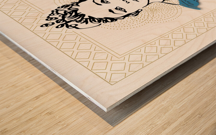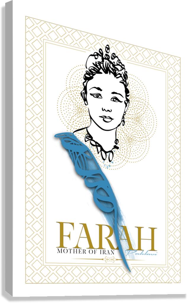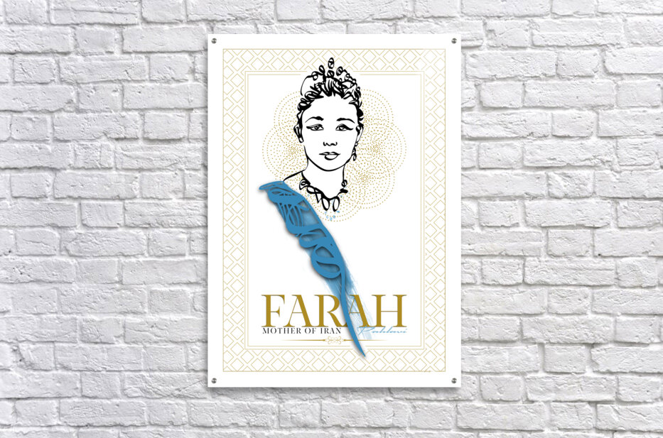 This artwork by David Mantegh is a tribute to Farah Pahlavi, the last queen of Iran, often referred to as the Mother of Iran. Using a refined line-art portrait, intricate gold patterns, and Persian-inspired design elements, the piece exudes elegance and cultural reverence. The blue sash, stylized with calligraphic detailing, symbolizes her role in Iranian history and the legacy she represents. The minimal yet luxurious composition highlights a blend of modern and traditional aesthetics, making it a timeless tribute to an iconic figure.