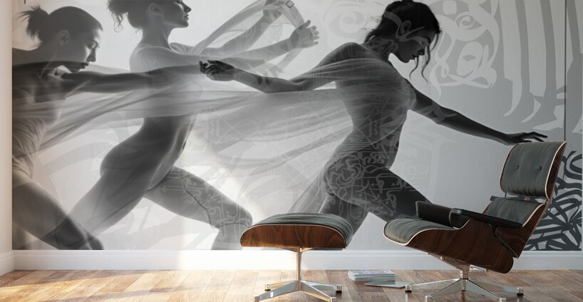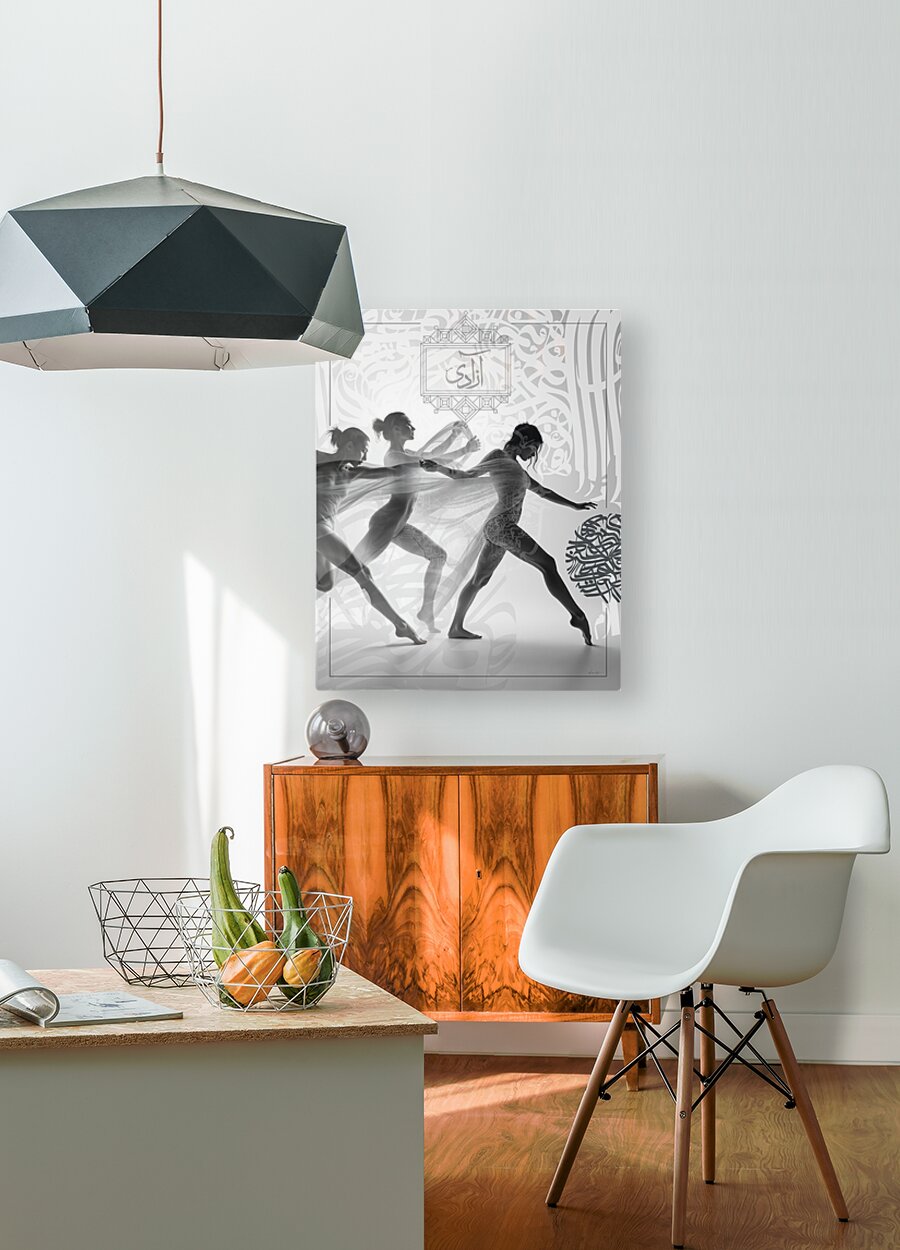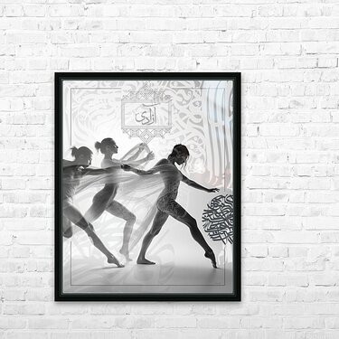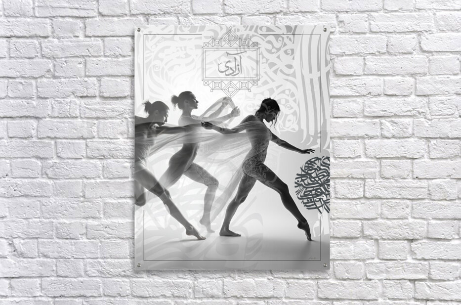 "Freedom" by David Mantegh is a powerful visual representation of liberation, movement, and transformation. The dynamic composition captures a dancer breaking free from constraints, symbolizing the journey from oppression to self-expression. The fluid motion, layered transparency, and intricate Persian calligraphy merge to reflect a struggle for identity and empowerment. The monochrome palette enhances the emotional depth, creating a timeless and universal statement on freedom of the body, mind, and soul.