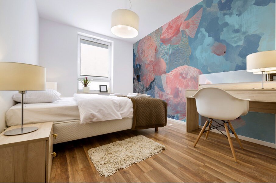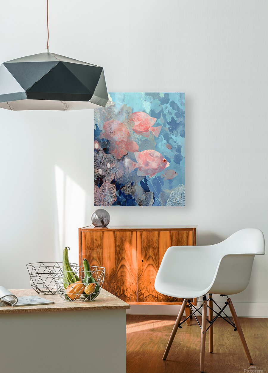 The composition follows a school of glowing fish swimming past gossamer-like corals. With rich teal and peachy hues, the flowing forms merge abstract ...[+]
