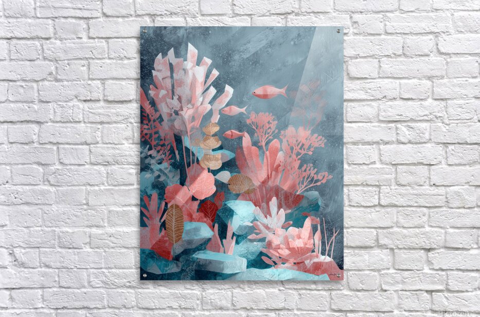In this ethereal piece, sea foliage and coral formations interlace with crystal-like geometry, evoking a secret garden under the waves. The painterly brushstrokes and hand-drawn textures breathe life into an otherworldly reef teeming with organic elegance and quiet energy.