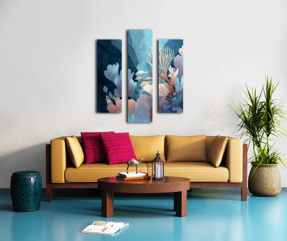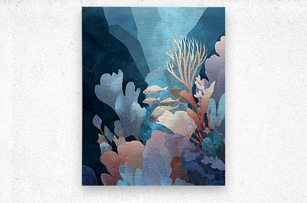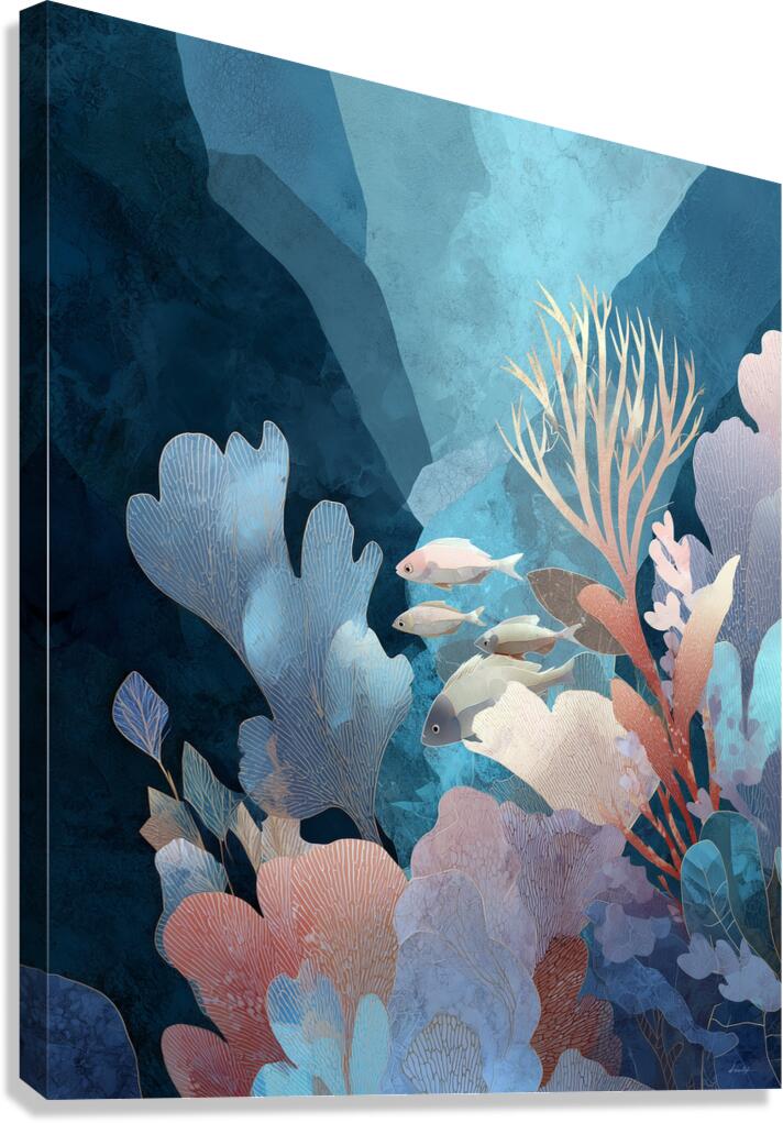 A serene underwater composition that explores the harmony of marine life and botanical abstraction. Soft-edged coral structures bloom in blush, gold, and azure tones, creating a delicate forest beneath the sea. Fish glide gracefully through layered textures and translucent washes, evoking peace and fluid movement.