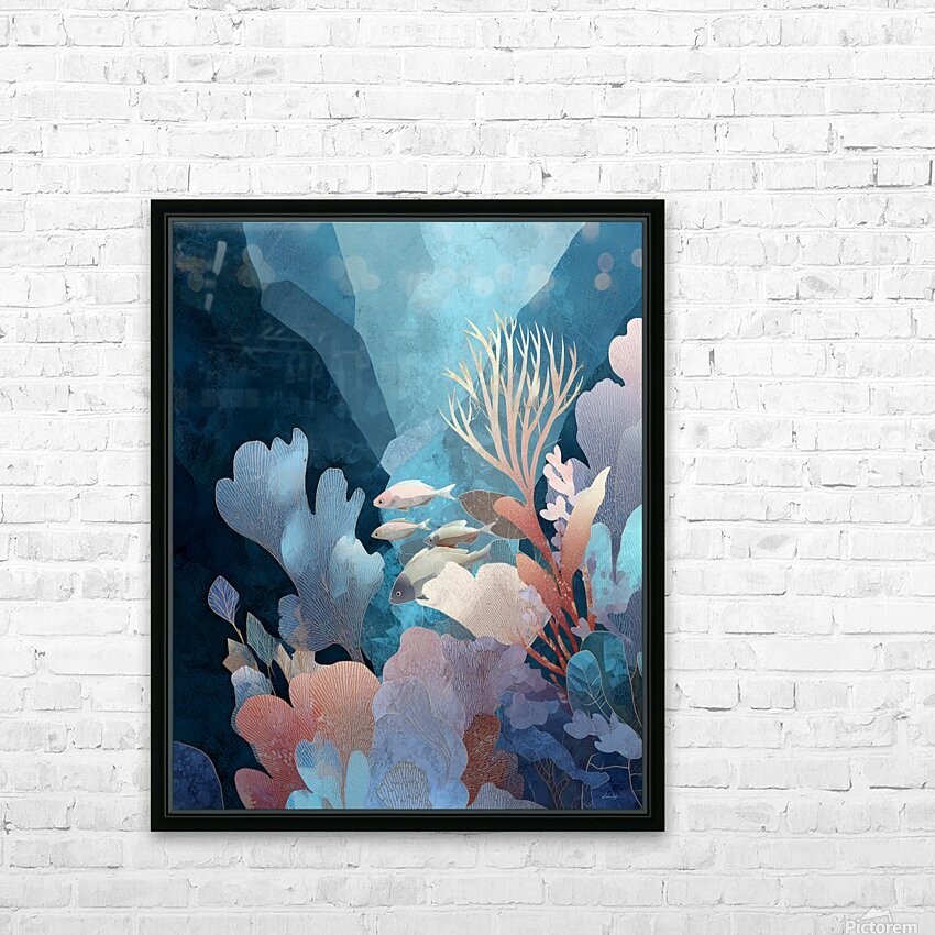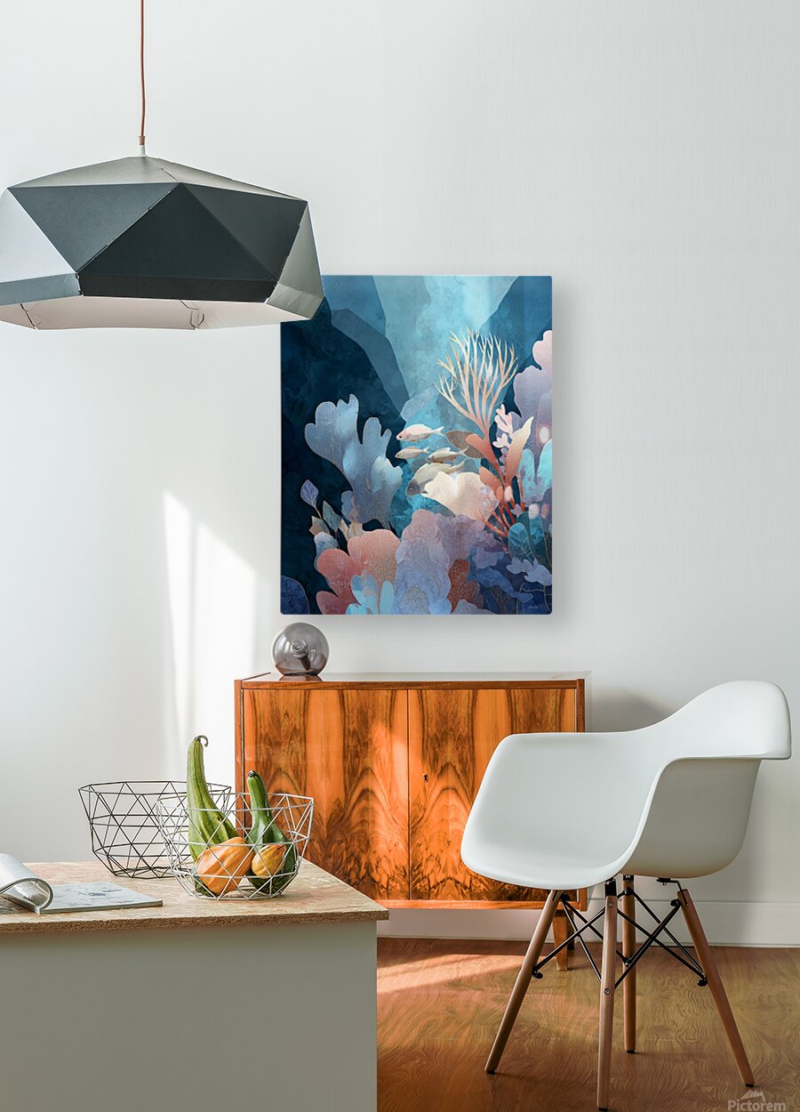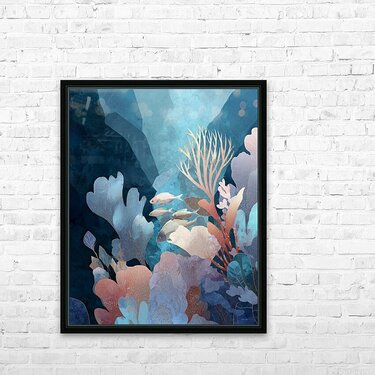 A serene underwater composition that explores the harmony of marine life and botanical abstraction. Soft-edged coral structures bloom in blush, gold, ...[+]
