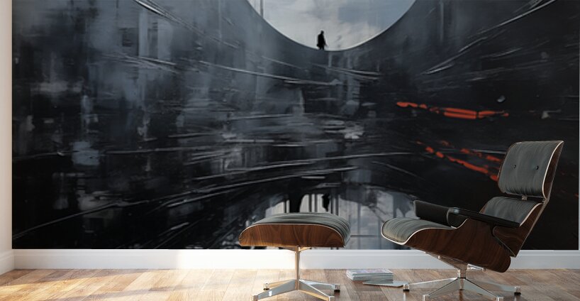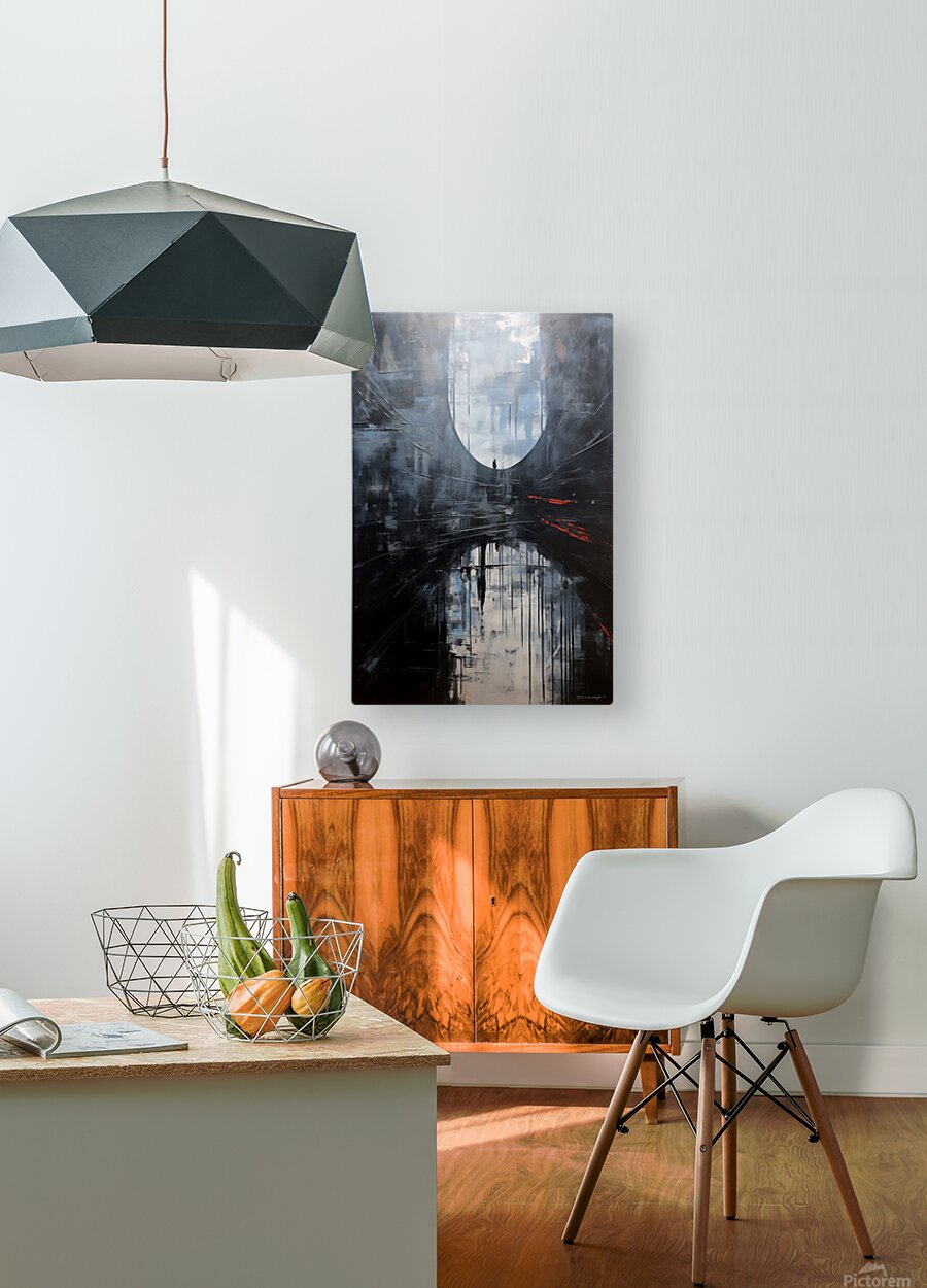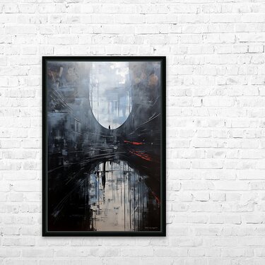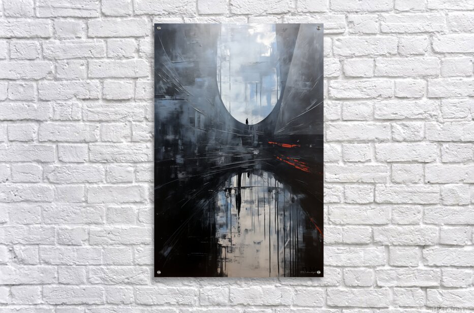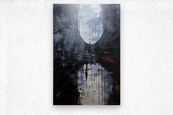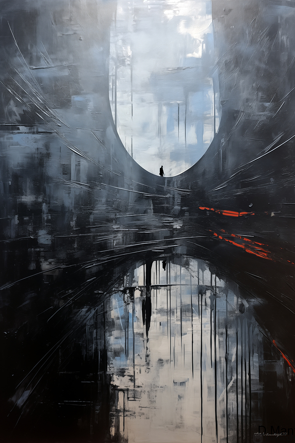 This painting titled “The Portal Within” explores the journey of solitude, introspection, and transition between realities. A lone figure stands before a vast, ethereal archway—an abstract threshold—while their reflection below deepens the duality of presence and memory. With cool hues of slate, misty whites, and a jolt of red suggesting latent tension or transformation, the composition evokes feelings of existential depth and cinematic melancholy. The work blends atmospheric abstraction with symbolic narrative, inviting viewers to reflect on identity, time, and the unknown that lies ahead.