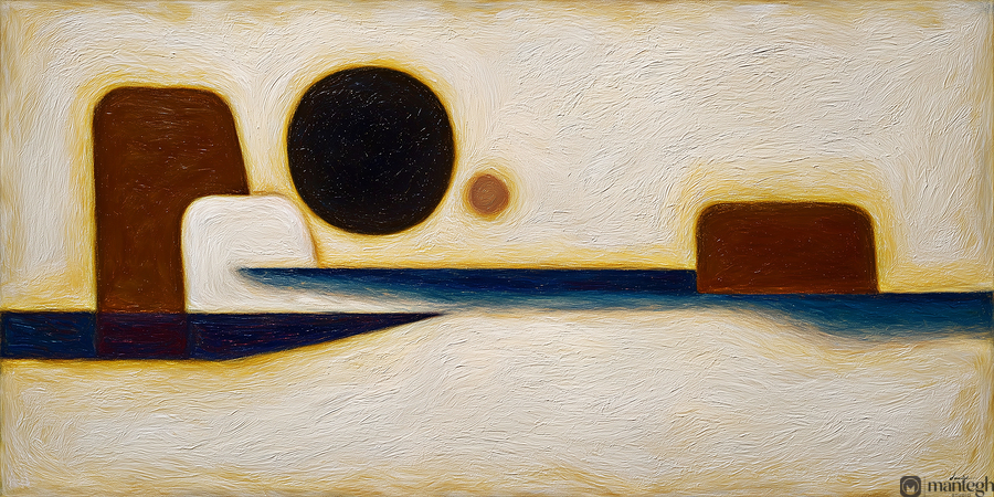 This artwork is part of a minimalist abstract series, featuring geometric shapes in an orchestrated rhythm of forms and colors. The composition brings forward a visual tension between solidity and flow—large circles, a dominant dark rectangle, and connecting lines float across a textured surface. The palette—creamy whites, deep ochres, indigo blues, and near-black—evokes a timeless sense of balance and introspection. The placement and interaction of shapes suggest movement, time, and transition, like a silent coded message between precision and emotion. This work invites the viewer to meditate on space and relationship beyond language.