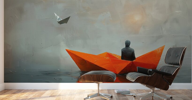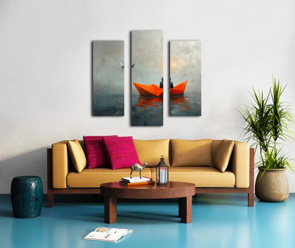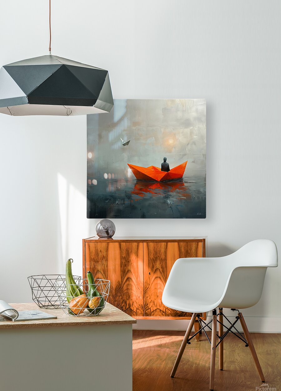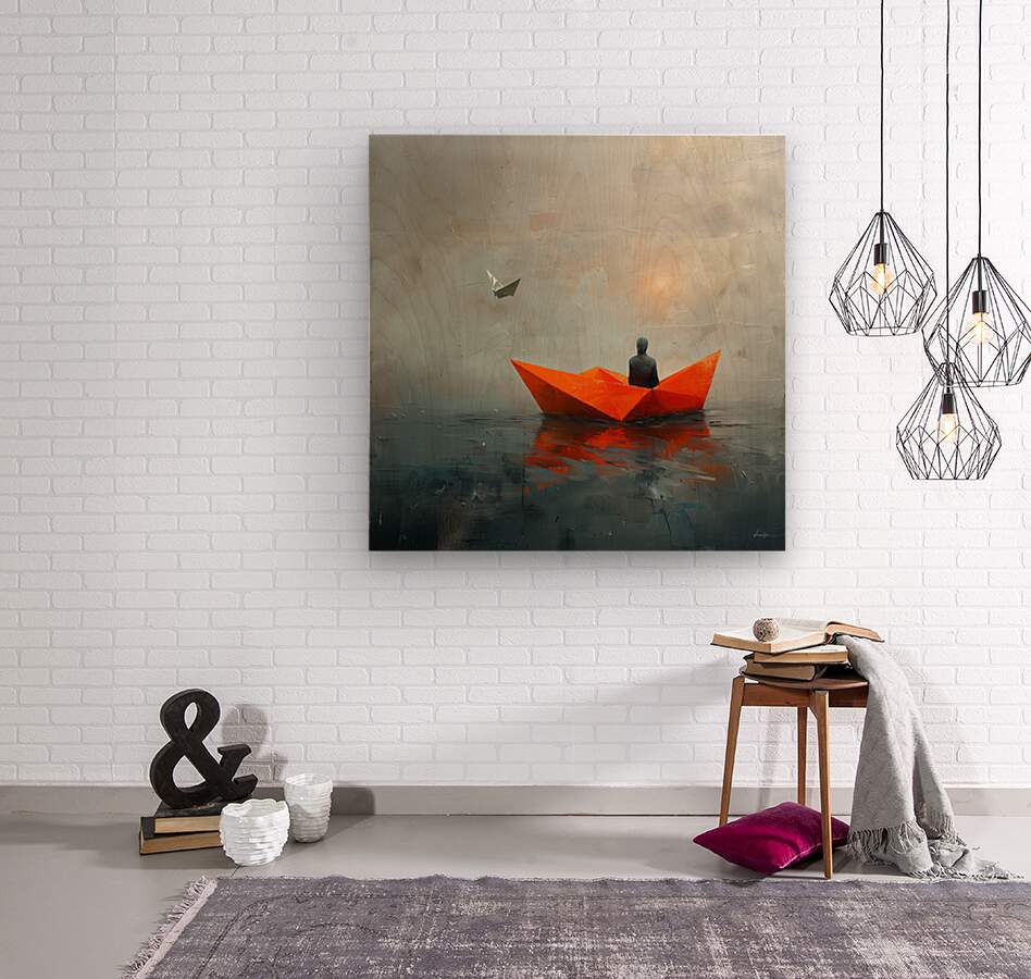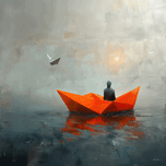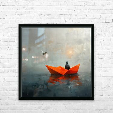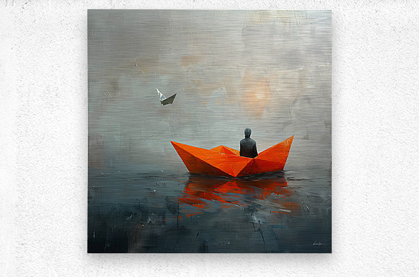 Life Trip 3 concludes the series with a powerful sense of introspection. The solitary figure in the bold red boat sits surrounded by vast waters, its reflection blazing across the surface. The muted sky and textured brushwork contrast with the vivid boat, emphasizing the strength of individuality amid uncertainty. A poetic meditation on resilience and the human journey.