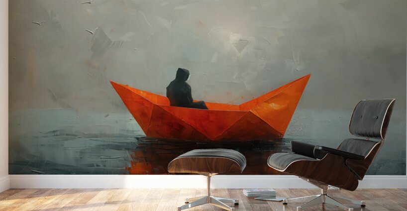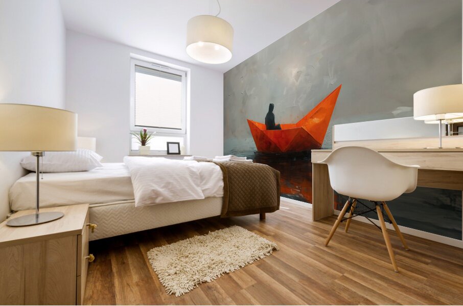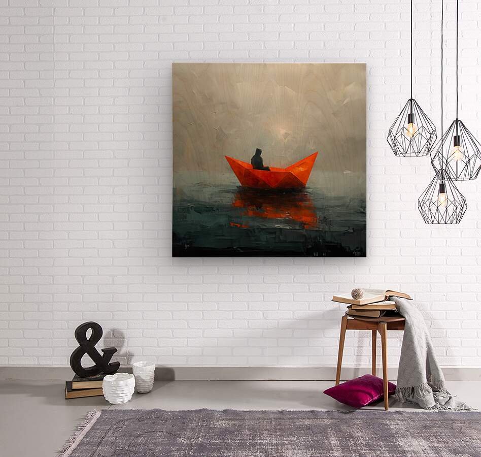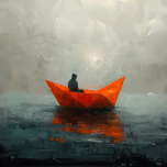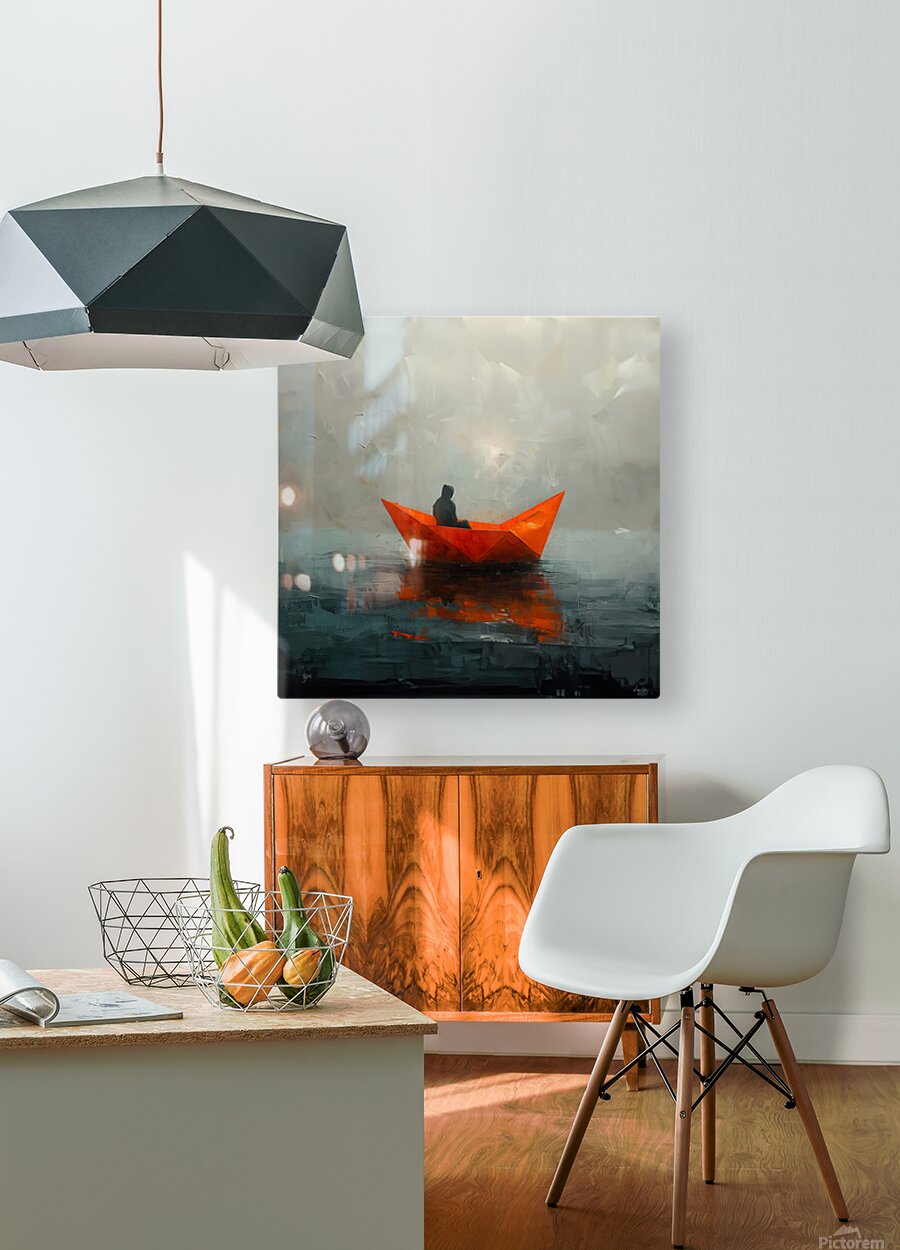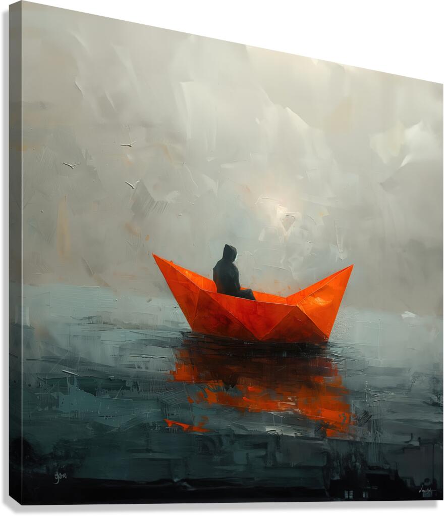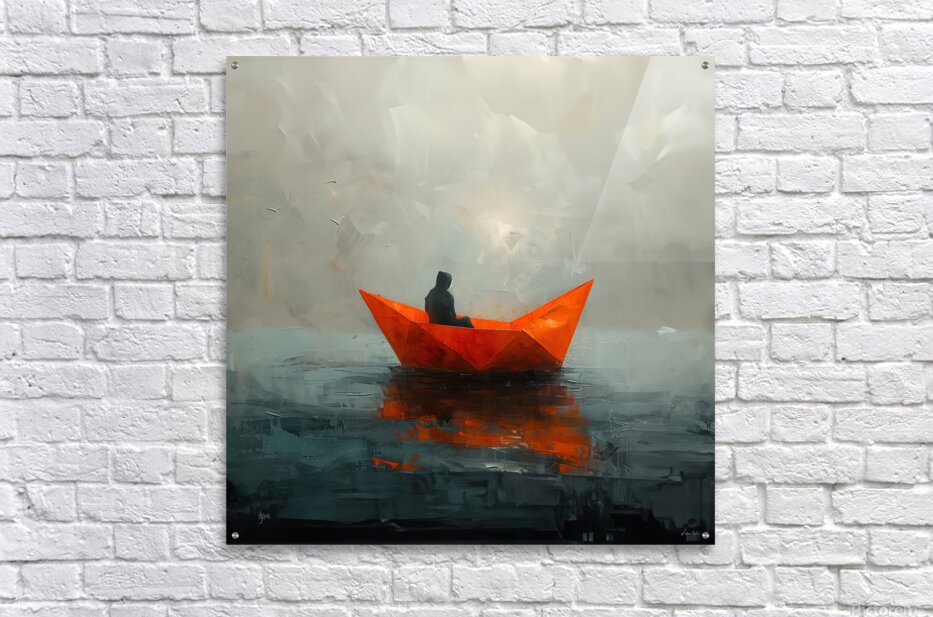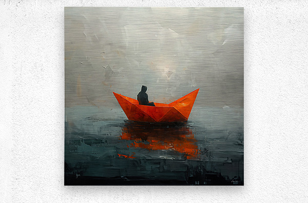 Life Trip 2 continues the series with a contemplative figure facing the horizon from inside a vivid red boat. The textured sky and moody reflections in the water create an atmosphere of transition — a metaphor for navigating life’s uncertainties. This piece evokes both quiet strength and a sense of endless possibility.