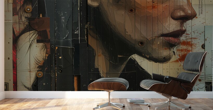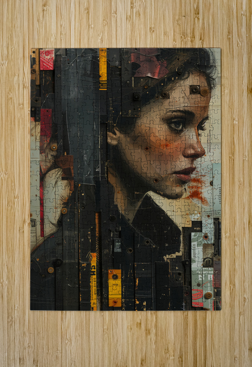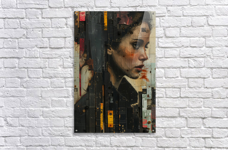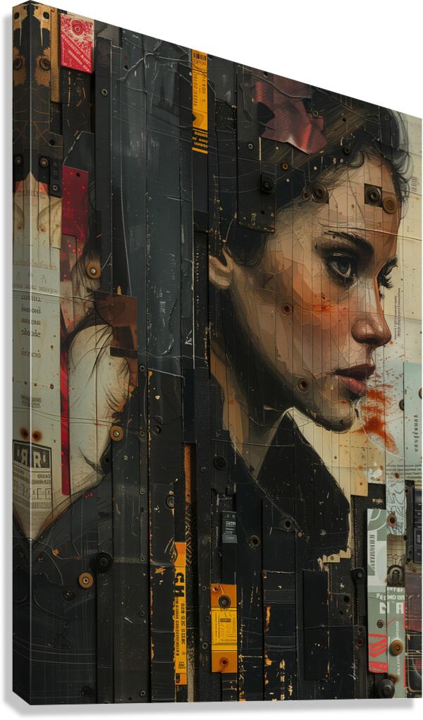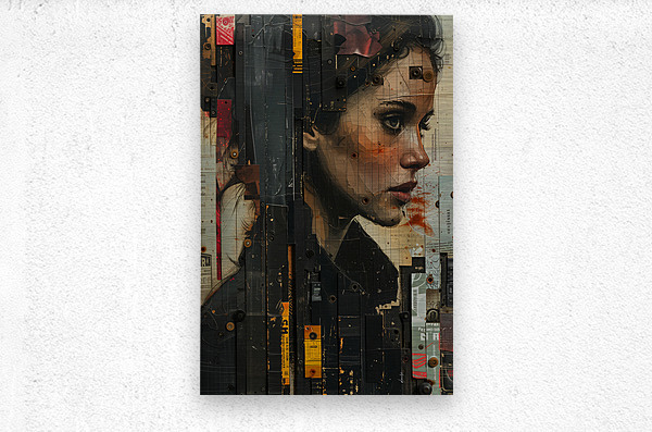 Title: parallel essence-2. This modern mixed-media portrait by David Mantegh, presented by Mantegh Studio, blends industrial textures and vibrant colors to create a compelling and visually layered composition. The artwork features a striking female portrait juxtaposed against a backdrop of urban elements, collage patterns, and intricate details. The use of varied materials and textures adds depth, while the subtle splashes of red and yellow bring warmth and intensity. This unique blend of realism and abstraction invites viewers into a world of urban storytelling and emotion. The artwork exemplifies Mantegh Studio’s dedication to creating one-of-a-kind pieces that transform any space with their bold and imaginative presence.
