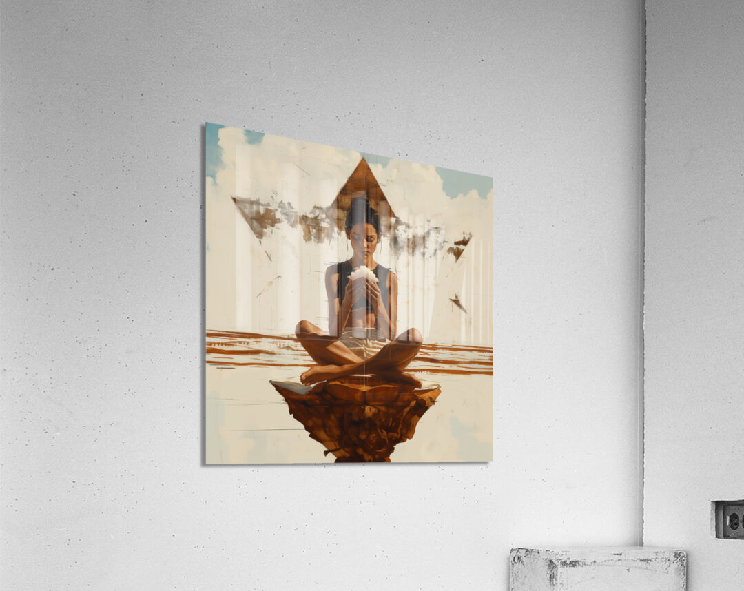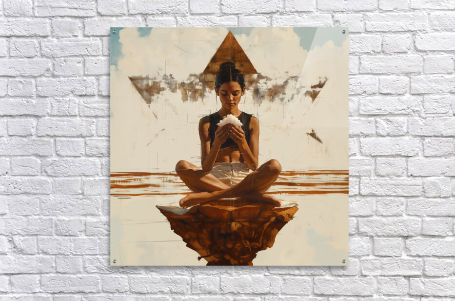 This painting by David Mantegh showcased by Mantegh Studio portrays a serene figure in deep meditation seated atop a sculptural base with a soft glowing object in her hands. The scene is framed by a symbolic pyramid evoking a sense of spiritual balance and sacred energy. The smooth yet earthy tones and minimalist composition invite viewers into a mindfulness reflection and calm space. The careful attention to detail and symbolic elements create a captivating narrative that celebrates inner peace and the power of contemplation. This artwork is a testament to Mantegh Studio’s dedication to producing thought-provoking high-quality pieces that resonate with personal and spiritual journeys.